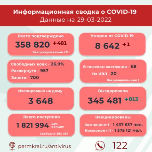 natka Опубликовано 28 марта, 2022 Опубликовано 28 марта, 2022 По состоянию на 28 марта в "Краевой больнице им.Вагнера Е.А." в инфекционном отделении на лечении находятся 35(+1 к 25 марта) человек, из них с подтверждённым диагнозом – коронавирусная инфекция – 19(+2) пациентов. По предписанию Роспотребнадзора 36(-1) человек с подтверждённым диагнозом - COVID-19 изолированы и проходят лечение на дому.