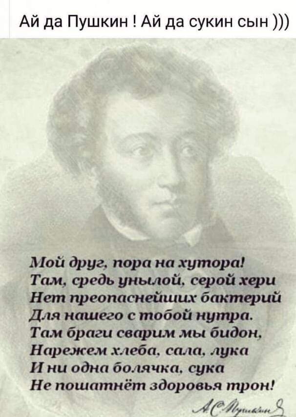ЭлектроНик Опубликовано 20 сентября, 2020 Опубликовано 20 сентября, 2020 (изменено) 3 часа назад, Павел сказал(а) : Пушкин х-ни не посоветует! Автором "актуального" стишка оказался... поэт-блогер из Казахстана! Этим своим стихотворением казахский блогер с ником Урри Грим в своём фейсбуке поздравил земляков-казахстанцев... с праздником Весны, Наурыз. Так что увы, этот казах далёк от Пушкина так же, как Земля от края Вселенной Изменено 20 сентября, 2020 пользователем ЭлектроНик 2