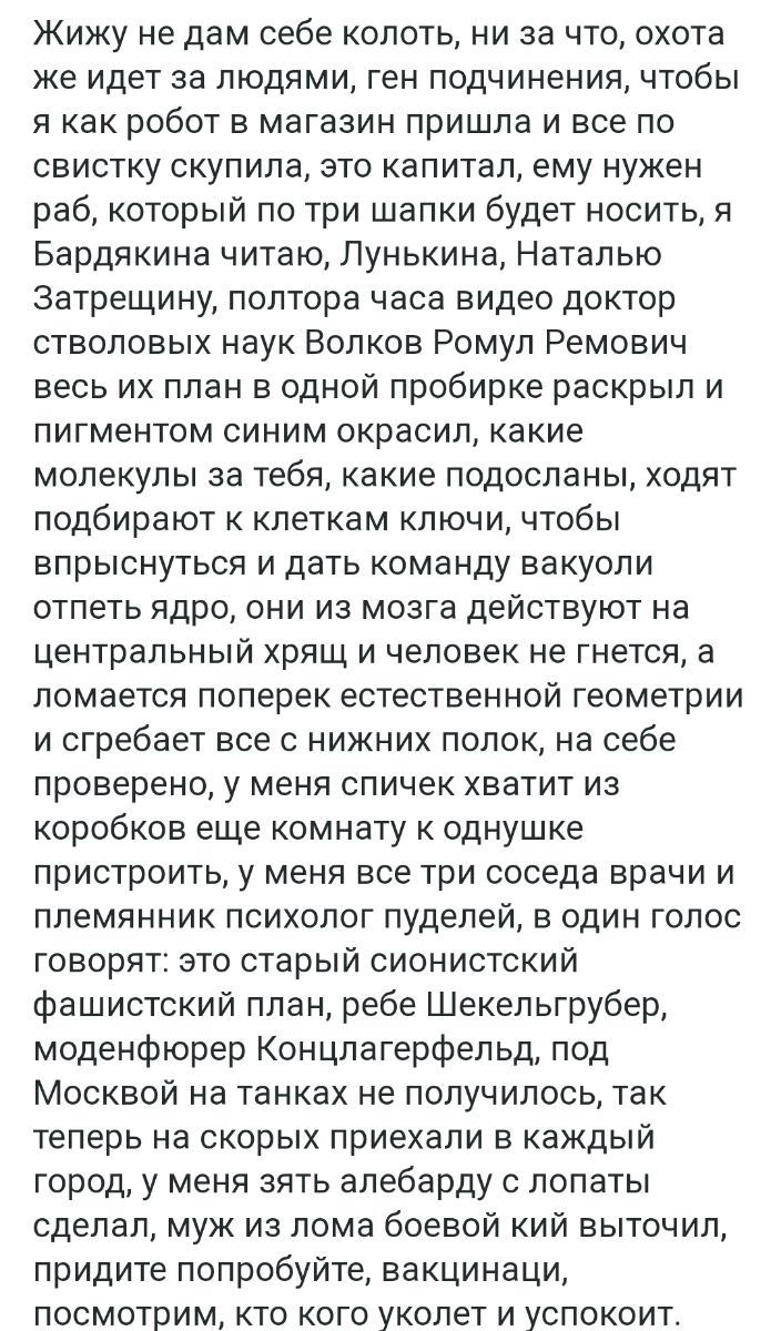 surger1984 Опубликовано 9 ноября, 2021 Опубликовано 9 ноября, 2021 5 часов назад, jimm031 сказал: Признак деградации - это ползанье по всяким помойкам и неумение отличить нормальную инфу от бреда всяких дебилов, поцреотических икспердов, английских антиваксеров и прочей шушеры. Я то как раз умею различать инфу. А вот ты зафиксился на своей линии. Врач, от простого обывателя, тем и отличается, что смотрит на ситуацию критически. Думаешь, я другие источники не читаю? Читаю, и формирую на их основе свое мнение уже. 1