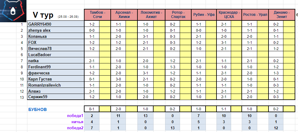 расписание матчей 5 тура! улучшаем сервис, а также вдруг кто вспомнит про не сделанный прогноз ? 25 августа - сегодня))