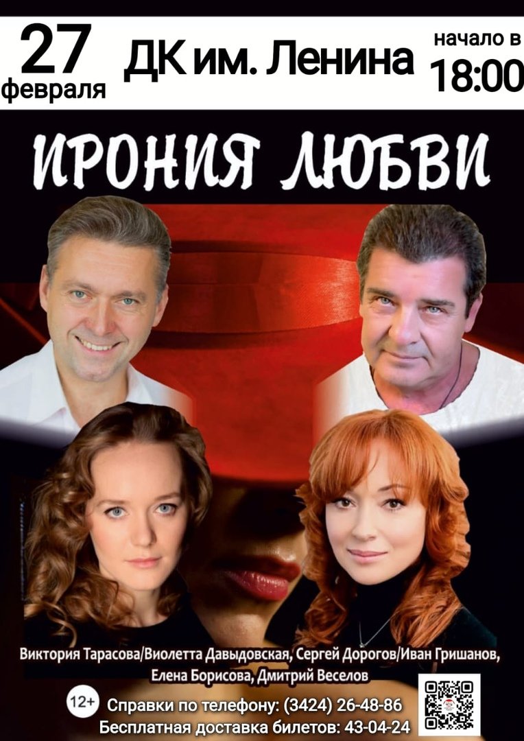 КУЗЬМИ4 Опубликовано 8 февраля, 2021 Опубликовано 8 февраля, 2021 Лирическая комедия "ИРОНИЯ ЛЮБВИ" 27 февраля на сцене ДК Ленина.Муж с женой живут вместе уже 15 лет. У них есть дети...Муж считает, что за 15 лет брака знает все о своей жене. Она хорошая хозяйка и мать, но с годами стала скучной, неинтересной, «прочитанной книгой» и муж решается зарегистрироваться на сайте знакомств и заводит виртуальный роман с незнакомкой по имени Ева. Сюжет закручивается, когда жена узнает об этом. Стремительные виртуальные отношения становятся реальными. Женщина умна и очень соблазнительна. Правда прячет лицо и предпочитает встречаться в темноте, но это еще больше распаляет мужа. В отличие от опостылевшей однообразной жены, Ева — загадочна и притягательна…Актеры: Виолетта Давыдовская, Сергей Дорогов, Елена Борисова,Дмитрий Веселов. Мероприятие, согласно ограничениям Роспотребнадзора, проходит при 50% заполняемости зала (шахматная рассадка).Количество мест в зале ограничено.Заказ билетов (от 600 до 1400 руб.) по 26-48-86 (для частных лиц) 43-04-24 (для организаций)