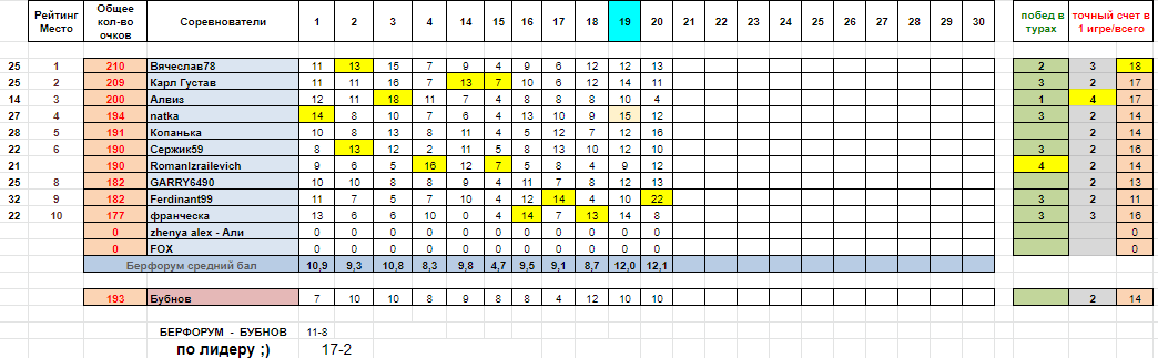 Копанька и Вячеслав 78 задерживаются, у Сержик59 нет последних двух прогнозов!