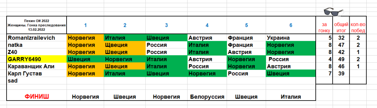 GARRY6490 Опубликовано 13 февраля, 2022 Автор Опубликовано 13 февраля, 2022 Ж - Швеция - Норвегия - Италия- Австрия - Норвегия - Россия М - Норвегия - Норвегия - Франция - Россия - Швеция - Россия ЗЫ Однако что-то не то напрогнозил, с утра плющит... Хотя... Это ж голос свыше был. Так что всё ровно. Голос свыше не врет.