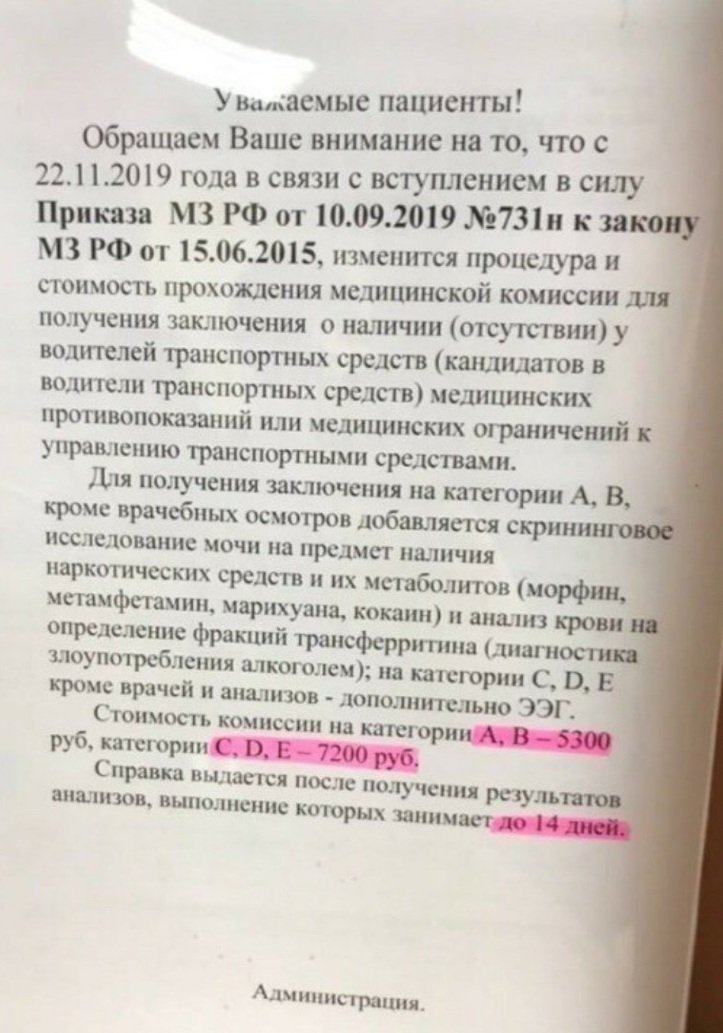 GARRY6490 Опубликовано 20 ноября, 2019 Опубликовано 20 ноября, 2019 Не, там чота типа анализы по отсутствию всего спектра наркотических веществ, спецпроверка на алкоголь и т.д. и т.п. Анализы платные и даже очень, как я понял. Цитата С 22 ноября 2019 года получить медсправку водителям станет труднее и дороже. Приказ Минздрава РФ, обнародованный 11 ноября 2019 года на официальном интернет-портале, изменяет порядок проведения обязательного медосвидетельствования водителей. С 22 ноября водители будут направляться на дополнительное медобследование. Людям нужно будет пройти не только нарколога-психиатра, но и обязательные лабораторные исследования, которые покажут, употребляет ли человек алкоголь или запрещенные вещества. Стоимость этих исследований высока, поэтому и справка значительно подорожает: по некоторым данным до 7 - 7,5 тысяч рублей. И если раньше справку можно было получить за один день, то срок увеличится до двух недель.