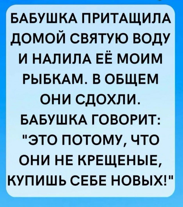 frend Опубликовано 19 января Опубликовано 19 января 18 минут назад, Таргитай69 сказал: Надоть "святой" водой наполнить всю посуду в доме))) 1