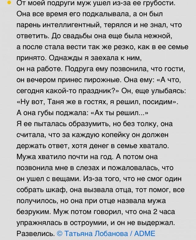 Техрук Опубликовано 26 марта, 2024 Автор Опубликовано 26 марта, 2024 Нуштож... Каждая женщина хочет встретить мужчину своей мечты, сильного, доброго, ответственного, но часто ослеплённая чувствами она не замечает плохих качеств, и тревожных сигналов, которые говорят о том, что перед ней вовсе не принц, а обычный «пополамщик».Первое, что нужно понять: мужчина, который убеждён, что все траты, он должен делить ровно пополам с женщиной, носит название «пополамщик».Определить такого мужчину не сложноЕсли на первом свидании, он предложит оплатить счёт пополам, сомнений нет- это типичный «пополамщик».Построить полноценные отношения с таким человеком будет сложно, поэтому бежать без оглядки будет единственным верным решением. Поскольку «пополамщик» - это человек, который вряд ли станет делить с человеком все невзгоды, и трудности настоящей жизни, но захочет уютно устроить себе уютное проживание, за чужой счёт, и при помощи чужих сил.Фразы, которые часто используют «пополамщики»:- Почему я должен содержать кого – либо?- Покупать цветы на первое свидание не стоит. Неизвестно, будет ли второе.- Я уже платил теперь твоя очередь.- Всем девушкам нужны только деньги.Это некоторые из фраз, по которым можно узнать «пополамщика».«Пополамщик» будет сводить на нет, все попытки партнёрши, доказать, что её вклад в семью, и бюджет тоже не маленький.Разговоры о том, что бюджет должен быть у каждого свой, что каждый обязан внести свою половину денег в семью будут не редки. При этом делить пополам обязанности бытового плана, он не станет.После тяжёлого трудового дня, предпочтёт спокойно отдыхать на диване, в то время как партнёрша, после работы, должна будет готовить, и убирать.Надо понимать, что если в семье раздельный бюджет, то это вовсе не означает, что мужчина непременно «пополамщик».«Пополамщик» - это мужчина, который вносит вклад в бюджет меньше, чем женщина, и не желает брать на себя ответственность в случае непредвиденных расходов.Такой мужчина, в случае тяжёлого финансового положения, скорее всего обвинит женщину в неоправданных тратах, и лишит её денег, либо в разы уменьшит её траты.В семейной жизни, с таким человеком будет крайне тяжело, ибо в трудной финансовой ситуации, он будет думать лишь о себе, и скорее всего оставит свою женщину наедине с её проблемами.