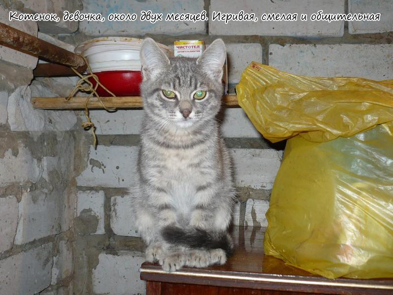 Ольга Жигульская Опубликовано 6 декабря, 2010 Автор Опубликовано 6 декабря, 2010 В приюте вновь появились два котенка - сестренки, в очень плачевном состоянии. Одной помочь не удалось, а вот Катюха начала поправляться, уже мурлычит, кушает и любит побегать, жаль выпускать из клетки боязно. В комнату ветврача, где они живут, постоянно забегают собачины. Правда Манька их выгоняет и никого не пускает, но все равно переживаем. Одну серую кошечку уже забрали, а черненькая - Кэти до сих пор сидит. Сейчас хоть им вдвоем повеселее. Правда одну клетку пришлось отдать под голубя. Подобрали обезноженного в снегу. Может быть у кого-нибудь есть клетка для птицы, будем очень благодарны, а то котофейкам вообще в одной тесно. А это наша Катька, возраст - около 2-х месяцев.