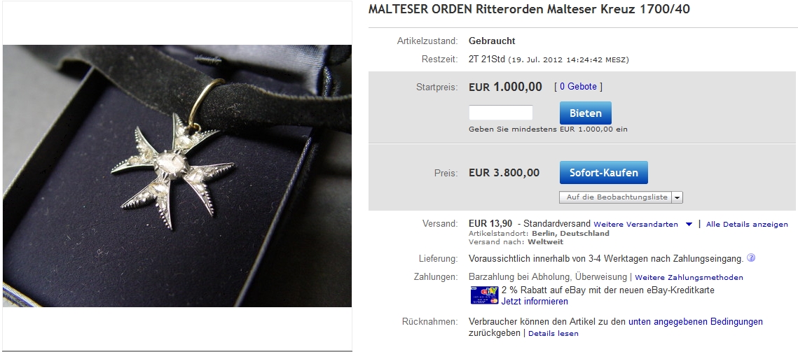 ЭлектроНик Опубликовано 16 июля, 2012 Опубликовано 16 июля, 2012 Нужно смотреть в интернете,но мне лень.Если вам нужно ищите. В продолжение о знаке Мальтийского ордена. Стартовая цена 1000, купить сразу 3500. Какова вероятность, что это фальшивка ? Процентов 100 ? Вряд-ли меньше.