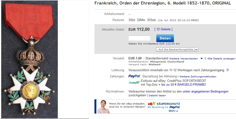 Гость carp Опубликовано 16 июля, 2012 Опубликовано 16 июля, 2012 Какова вероятность, что это фальшивка ? Процентов 100 ? Вряд-ли меньше. вероятность что это подделка равна 0,2% !10888 человек сказали что это серьёзный продавец который дорожит своей репутацией! так-что мимо... а французский легион уже 151€ стоит...