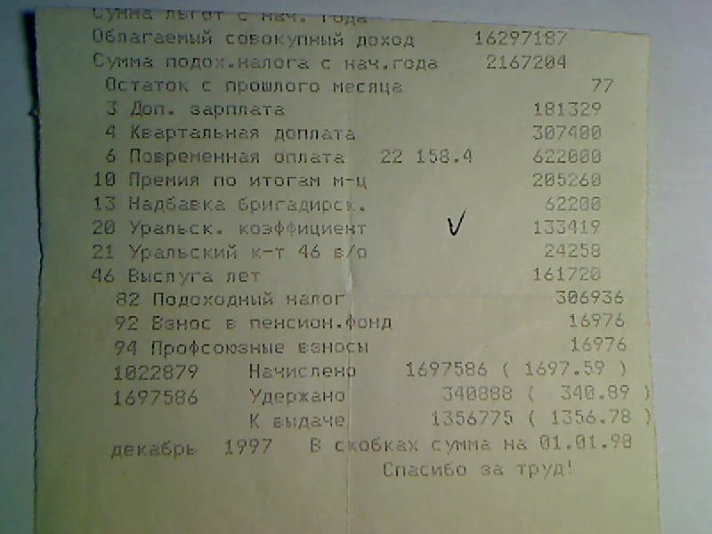 ANGSTREM Опубликовано 24 мая, 2020 Опубликовано 24 мая, 2020 Нашёл квиток за декабрь 1997 года . Начислено 1697586 рублей . полтора миллиона....... 4 1