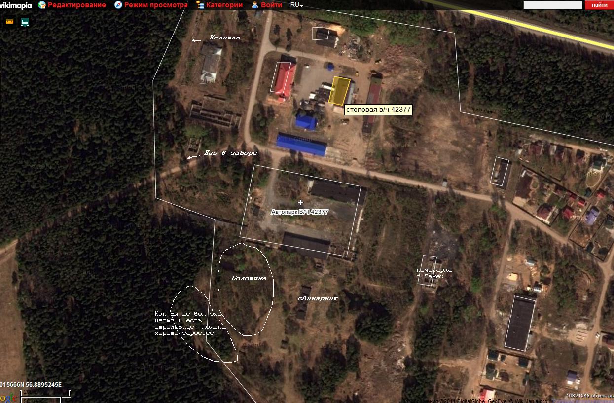 ЭлектроНик Опубликовано 17 ноября, 2011 Опубликовано 17 ноября, 2011 (изменено) Вот стрельбище быгельское. В воинской части никак не меньше должно было быть. http://www.wikimapia.org/#lat=59.4017305&lon=56.8743968&z=17&l=1&m=b В те далекие времена (конец 90-го года), когда я заканчивал там службу, окопы, из которых бросались учебные гранаты с боевыми взрывателями (чтобы воочию видеть, что и как происходит непосредственно перед взрывам самой гранаты) уже были в мелкой поросли сосен и березок. Эти окопы были метрах в пяти от огневого рубежа. Перед занятиями бойцы вырубали наиболее крупные, чтобы не мешали. Прошло уже больше 20-ти лет. Неужто кто-то за эти годы постоянно поддерживал стрельбище в надлежащем виде? За ним и в те времена практически не следили, только перед проверкой раз в полгода немного убирали. Причем стрелковое оружие было сдано где-то в 93-м, так что больше там стрельб не было. Скорее всего все уже заросло. Выходили на стрельбище через калитку и вдоль забора шли. Можно было и в дыру в заборе пролезть возле санчасти, чтобы не лезть сквозь поросль деревьев за забором. В части стрельбище представляло собой полосу с небольшим заглублением, шириной около 10-15 метров и длиной порядка 120. Располагалось с севера на юг. Южный торец был выложен бревнами и заглублен. Также была обваловка, общая высота (от мишени до верха насыпи) метров 5-8. С боков стрельбища в южной стороне тоже была обваловка. Изменено 17 ноября, 2011 пользователем Электроник