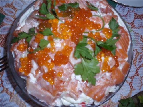 СветLана Опубликовано 18 ноября, 2011 Опубликовано 18 ноября, 2011 Внесу свою лепту: Я делала в кастрюле двухлитровой. Сначала постелила внутри кастрюли пищевую плёнку, потом стала выкладывать послойно: 1.Шампиньоны маринованные шляпками вниз 2,лук зелёный мелко порезанный майонез 3. 2-3 вар. морковки потереть на кр. тёрке 4.Огурцы маринованные(кружочками) майонез 5. Куринная грудка копчёная (мелко порезать) майонез 6. 2 плавл. сырка (на кр. тёрке) майонез 7.3-4 вар. картофелины (на кр. тёрке) майонез 8.4 яйца мелко порезать майонез Я делала с вечера, ночь простоял в холодильнике, потом перевернула на плоскую тарелку, благодаря пищ. плёнке всё прошло хорошо, хоть я и волновалась)))))) Ещё вот так однажды "извратилась" на день рождения мужа... второй раз вряд ли сподоблюсь, маятно очень)0))