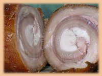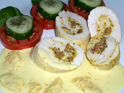 М Ƹ̴Ӂ̴Ʒ МАГДАЛЕНА Опубликовано 25 декабря, 2011 Опубликовано 25 декабря, 2011 так все стырено с простора инета 1. Отбить филе до толщины в 5-7 миллиметров , посыпать любимой приправой .я чесночную соль и перчик Отложить на время в холод . 2. замочить курагу в апельсиновом соке, отжать порезать так же порезать сыр и добавить орешки я беру соленый арахис . 3. Заправить ложкой майонеза . 4 . На каждое отбитое филе положить начинку и свернуть рулетиком . 5. Рулетик завернуть в кусок фольги плотно , закрепить концы , чтоб не вываливалась начинка , должен получится крулый рулетик , как большая конфета . 6. Отварить в кипящей воде 20 минут . Соус оставшийся сок (от кураги)нагреть добавить порошок имбиря прокипятить 5 мин.процедить. Затем добавить ,почищенные от плёнок, дольки апельсина и немного крахмала довести до кипения. полить рулетики и на здоровье схомячить :lol: Употреблять можно как горячими , так и холодными . После 20 -ати минут варки , оставила в этой же воде ещё на 30 минут , ничего абсолютно не произошло , остались горячими . После того , как рулетики будут готовы , можно их развернуть и несколько минут подержать под грилем , чтоб зарумянились . получится примерно так