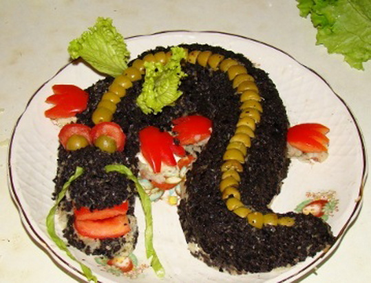 мыха-норуха Опубликовано 24 декабря, 2011 Опубликовано 24 декабря, 2011 Предлагаю вот такое украшение для салата " Селедка под шубой" Для украшения понадобятся 2 блинчика, свекла (натертая на мелкой терке), Сыр (натёртый на мелкой тёрке), чеснок(натертый)-добавить майонез и перемешать. По вкусу добавить соль, но если сыр соленый, то не надо..Данной смесью смазать блинчик и закатать рулетиком.( со вторым проделать ту же процедуру) Нарезать рулетики на кусочки по 2 см каждый и уложить на салатик..Ну а там как фантазия позволит-можно и зелень уложить.. и горошком зелёным посыпать..