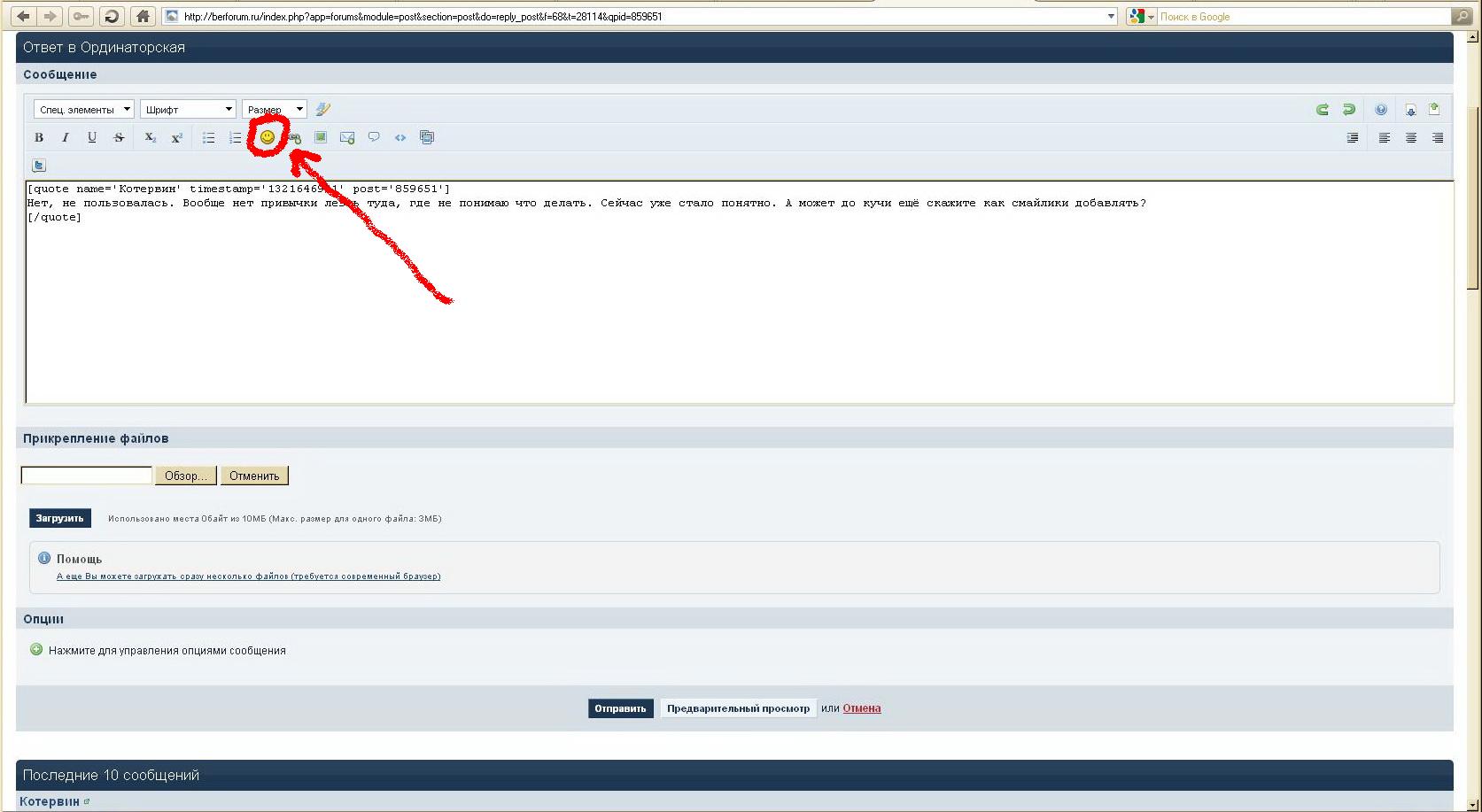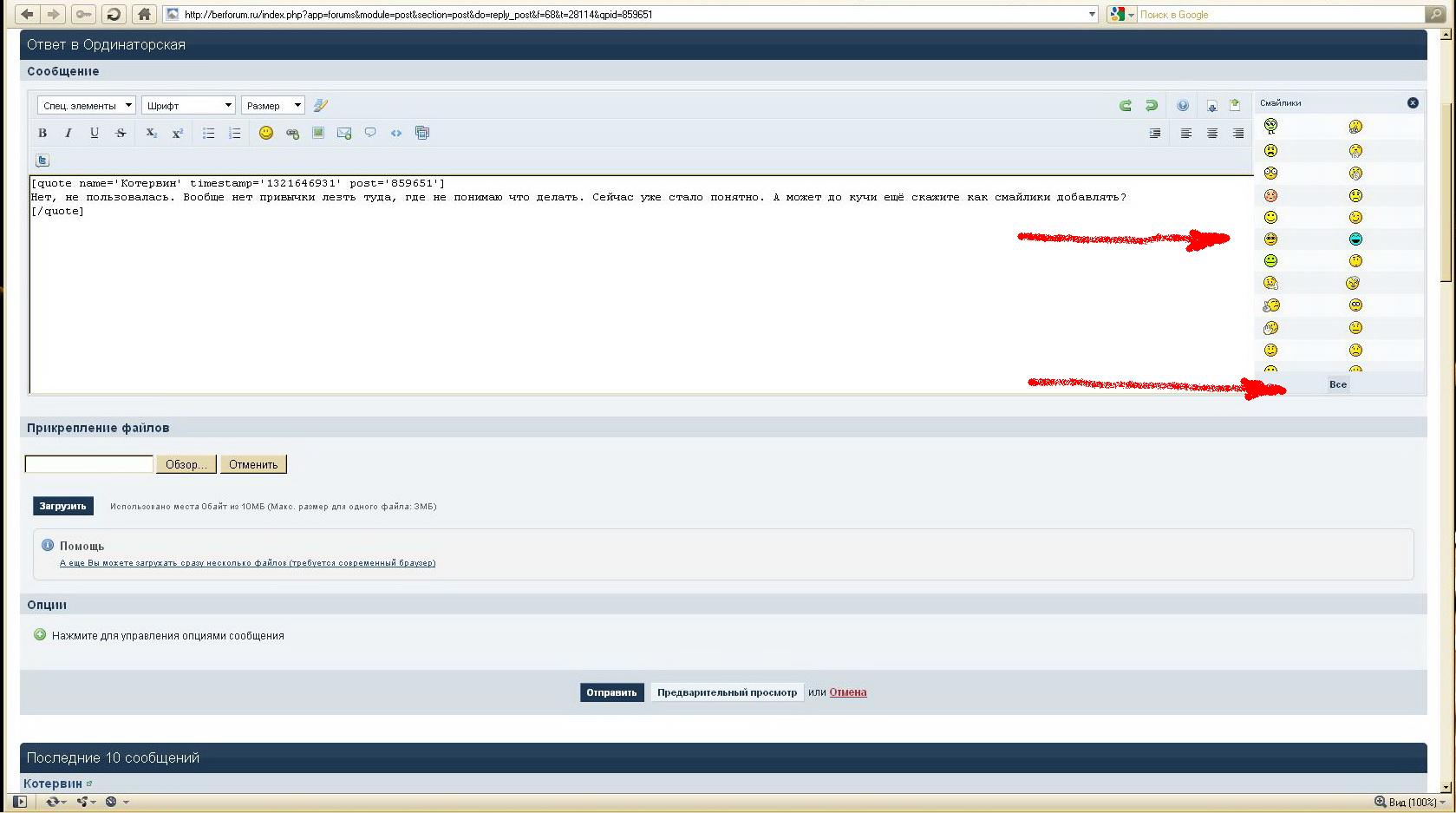 GreyBeard Опубликовано 18 ноября, 2011 Опубликовано 18 ноября, 2011 Нет, не пользовалась. Вообще нет привычки лезть туда, где не понимаю что делать. Сейчас уже стало понятно. А может до кучи ещё скажите как смайлики добавлять? Так всё там же... Находите кнопочку со "смайликом" на странице ответа: Нажимаете её и выходит меню "смайликов". Сначала с ограниченным количеством. А если надо больше, то нажимаете внизу кнопочку "все". И - всё... :dada: Доброго утра всем...
