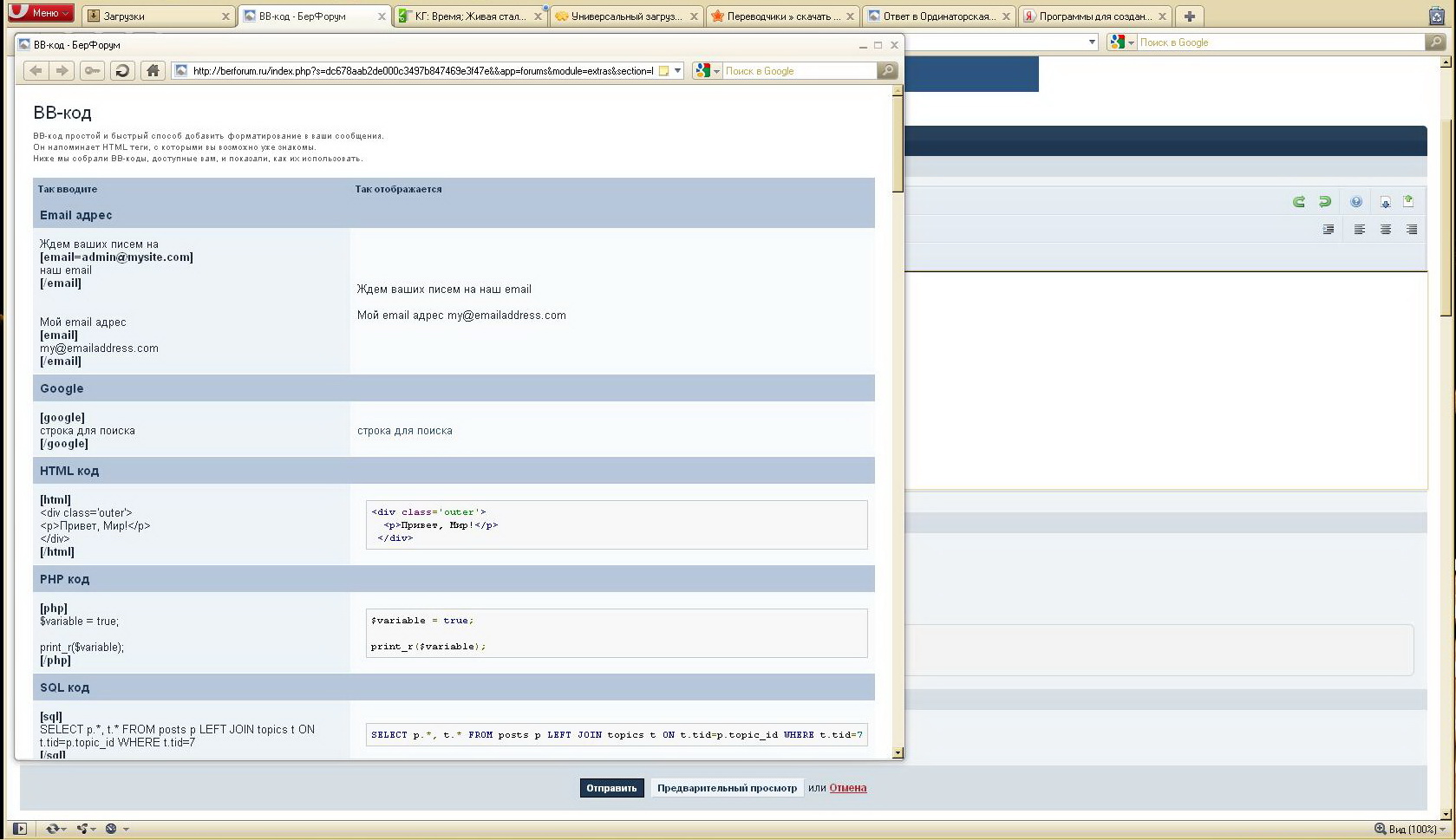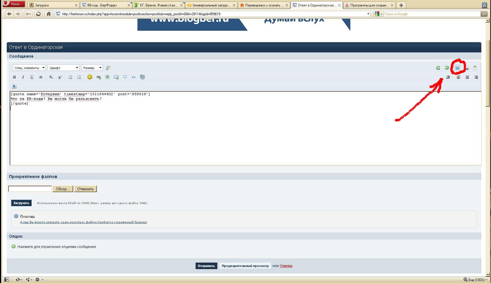 GreyBeard Опубликовано 18 ноября, 2011 Опубликовано 18 ноября, 2011 Что за ВВ-коды? Вы могли бы разьяснить? Разве Вы ими не пользуетесь? "BB-код простой и быстрый способ добавить форматирование в ваши сообщения. Он напоминает HTML теги, с которыми вы возможно уже знакомы. Ниже собраны BB-коды, доступные вам, и показано, как их использовать.". Это просто: На странице ответа у Вас есть кнопочка. Нажмите её и появиться меню BB-кодов. А далее - по необходимости и типу задачи...