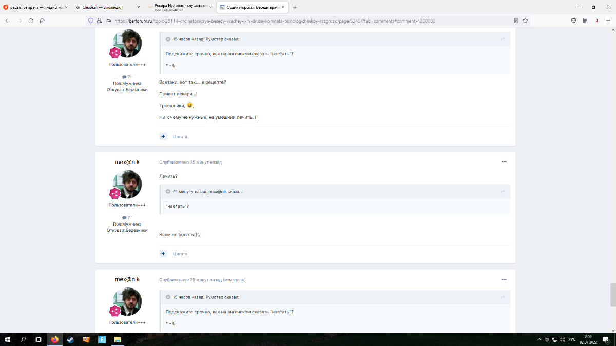 mex@nik Опубликовано 1 июля, 2022 Опубликовано 1 июля, 2022 14 часов назад, Румстер сказал: Подскажите срочно, как на англиском сказать "нае*ать"? * - б Всетаки, вот так..., в рецепте? Привет лекари...! Троешники, , Ни к чему не нужные, не умешнии лечить..)