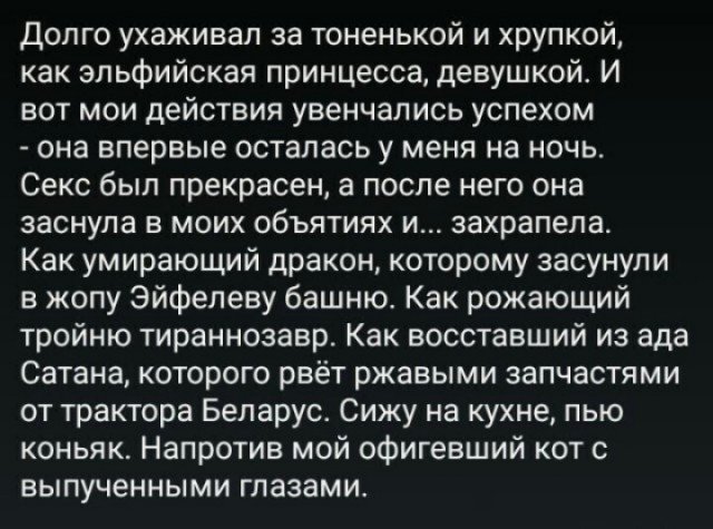 красная шапочка Опубликовано 12 апреля, 2024 Опубликовано 12 апреля, 2024 Вот так создаются комплексы! Низачто не буду ночевать ни с кем! А вдруг невзначай тоже храпну или еще круче чего надумаю. Хотя нет, мы принцессы спим тихо, и ничего такого не делаем, что могут позволить себе невоспитанные дамы.