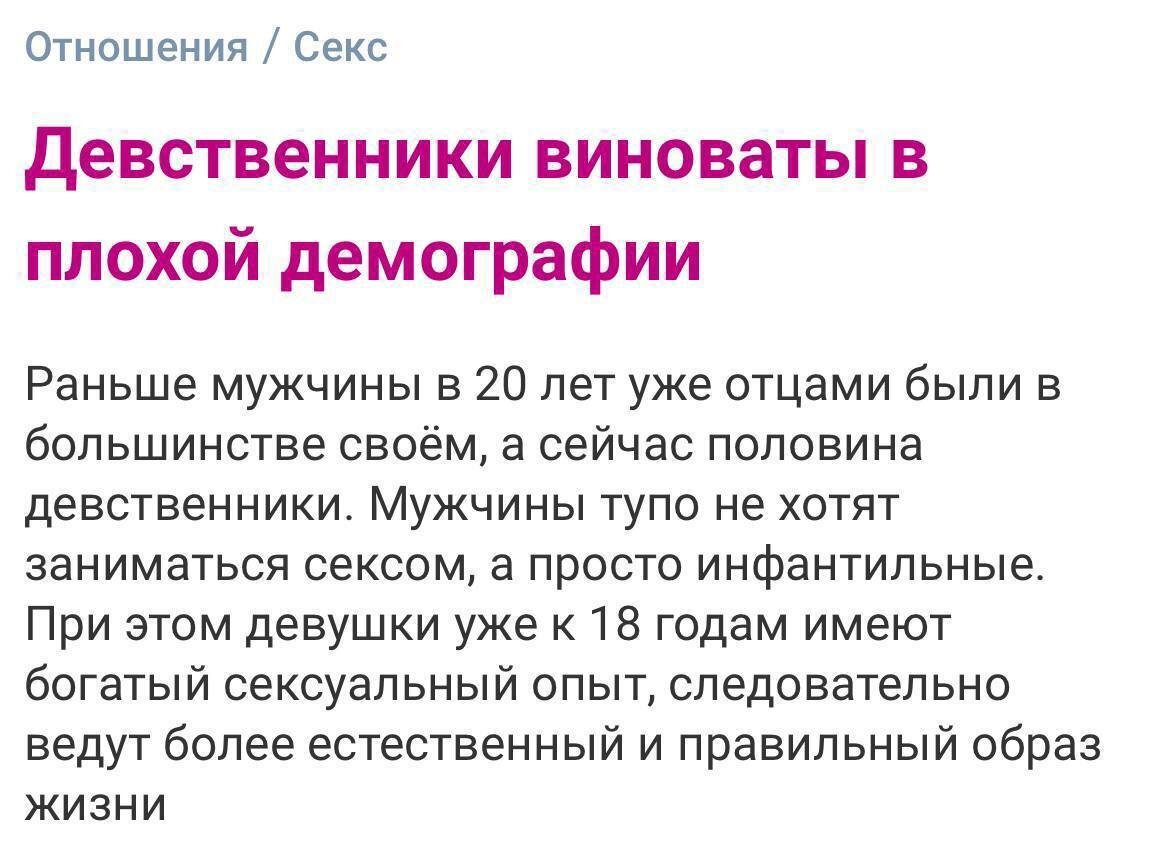 Караванщик Али Опубликовано 20 декабря, 2024 Опубликовано 20 декабря, 2024 1 час назад, Техрук сказал: Потому парни и не имеют сексуального опыта, что среди "девушек" в 18 лет девственниц уже нет. Ибо, хочется создать семью с непорочной спутницей, а их и в природе уже нет. Печалька. В нашо время было больше нравственности. Девчонки 10 классов заканчивали девственницами практически все.