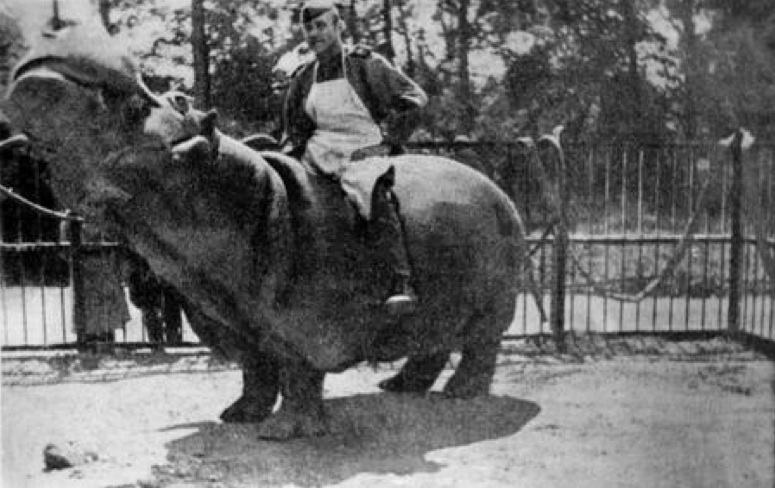 surger1984 Опубликовано 27 мая Опубликовано 27 мая Таки шо ви знаете за ветеринарию военную медицину??!? После штурма Кенигсберга в его зоопарке выжило всего 4 животных – лань, осёл, барсук и бегемот. Последнего зверя, 18 лет от роду, бойцы Красной Армии обнаружили неподалеку от зверинца, в речушке. Во время штурма города в животное, которого солдаты окрестили Гансом, попало несколько шальных пуль, он 13 дней провел без пищи и воды. Спас Ганса военфельдшер Владимир Петрович Полонский, который уже к лету 45-го выходил животное. Вот как он сам описывает историю лечения бегемота (орфография сохранена.): «Принял лечение к Бегемоту с 14 апреля с.г. (1945 года). Впервые оказал помощь водой. В последующем попытался дать ему молока. В следующий раз молотой свеклы. Бегемот принялся кушать. Но через 3 дня отказался. Я поспешил дать Бегемоту водки. Дал 4 литра. После чего Бегемот стал сильно просить кушать. Я сперва ему поставил клизму (4 ведра дистиллированной воды). После чего стал кормить его. Бегемот попытался выходить, но так как был пьян — он обронил себя. Боковое ранение (25х27 см). Глубина 4 см. Другая рана (6х7). Бегемот стал кушать, но не оправляется. Я поставил 2-й раз клизму (4 ведра дисц. воды). Бегемот стал оправляться. Прошло 2 недели. Бегемот кушает слабо. Я решил дать водки, 4 литра. Бегемот стал кушать, хорошо. Но обратно получился запор. Я поставил ещё клизму (4 ведра дисц. воды). Бегемот оправляется, но плохо кушает. Я решил дать водки (4 литра). И Бегемот отлично стал кушать. Встречались без аппетитные дни. Я устранял их переменой пищи…». О результатах лечения Ганса военфельдшер Владимир Петрович Полонский написал коротко: «Удалось спасти бегемота. Не отходя от него через 21 день, пройдя 1 мес. и 19 дней, я добился полного здоровья и сейчас занимаюсь дрессировкой бегемота — катание верхом на бегемоте по парку и т.д.» 27 июня 1947 года Калининградский зоопарк справил свой «второй» день рождения. На этот момент его коллекция состояла из 50 животных, в число которых входил и спасенный от верной смерти немецкий бегемот Ганс. 1