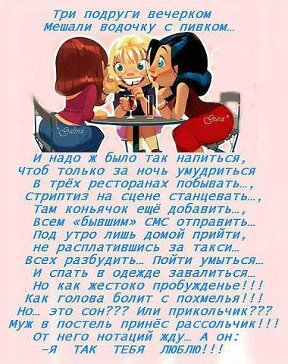GreyBeard Опубликовано 18 января, 2014 Опубликовано 18 января, 2014 Из Сети. (Не помню, было или нет...) "Что хочет женщина порой..." Что хочет женщина порой? Бокал вина и выходной. С подругой скромно посидеть. Немного выпить – прибалдеть. Духи чужие обсудить, О мужиках поговорить. Чуть захмелеть и закурить. Потом расплакаться в жилетку. Вновь зажигая сигаретку. Прибавив музыку слегка. Сплясать до слома каблука. И чтоб не кто, не приставал. Вопросы чтоб не задавал. Ты посмотри в глаза подруг. И оглядись потом вокруг.. Зачем нужны вам мужики? Ведь с ними сдохнешь от тоски. Им принеси, подай, налей. И не найдешь средь них друзей. У них одно лишь на уме. Пойдем в постель, иди ко мне. С подругой проще в тыщу раз. Смахни слезу с усталых глаз. С ней хочешь плачь, а хочешь смейся. Захочешь, в стельку ты напейся. Она поймет, она простит. С тобою вместе погрустит. Утрете слезы, посмеется. Поговорив, в умат напьется. Настало утро – бог ты мой. Шикарный вышел выходной. Глаз не сомкнули до утра. А сколько выпито вчера? © Источник: http://www.vampodaro...hi.php?stih=883
