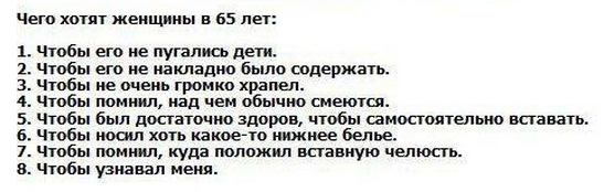 GreyBeard Опубликовано 25 апреля, 2015 Опубликовано 25 апреля, 2015 От ответа ушли, почему? А если молодая весит центнер и нифига не привлекательная, это для мужчины штучно? Впрочем, можете не отвечать, все и так ясно. Вчера приблизительно на эту же тему спорили с Адмиралом. К единому мнению пришли. Просто хотела услышать ещё Ваше. :) А как Вы думаете..? Нет. ''Штучно'' в данном контексте было - весьма качественно, неординарно, отличаюшейся от другого, других - в лучшую сторону, находящейся на высоком уровне духовных и физических качеств. Если ''если молодая весит центнер и нифига не привлекательная'', то у неё просто намного меньше шансов познакомться (найти себе...) с молодым, здоровым, привлекательным. И всё. В самом деле ясно..? (Напоминаю, :wink: мы с Вами никогда не были знакомы, и не знакомы...)... :wink: Об этом я ничего не знаю. Денег хочет не только женщина) или я ошибаюсь? Трудно сказать. Здесь важнее то, что обычно - женщина хочет много денег и побыстрее... И желание это (частенько) намного горячее, чем у мужчины. Об этом говорят простые наблюдения. А так-то homo - довольно жадное существо, независимо от пола и возраста. И неприятное...
