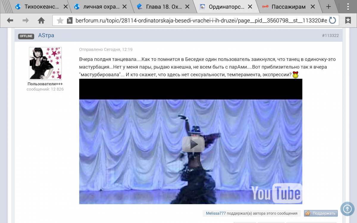 ASтра Опубликовано 15 мая, 2016 Опубликовано 15 мая, 2016 (изменено) Врачеватель душ дамских? Я бы сказала, инженер. До врачевателя там как до Пекина знаком зодиака. стасмихайлов этого форума. П.С. А танец то зацепил, ох зацепил..... вдруг слишком мало народу прочитает Написала именно там, где считаю нужным. И именно в той ветке публика в основном воспитанная, не позволяющая себе ничего лишнего. В последнее время за исключением... Изменено 15 мая, 2016 пользователем ASтра
