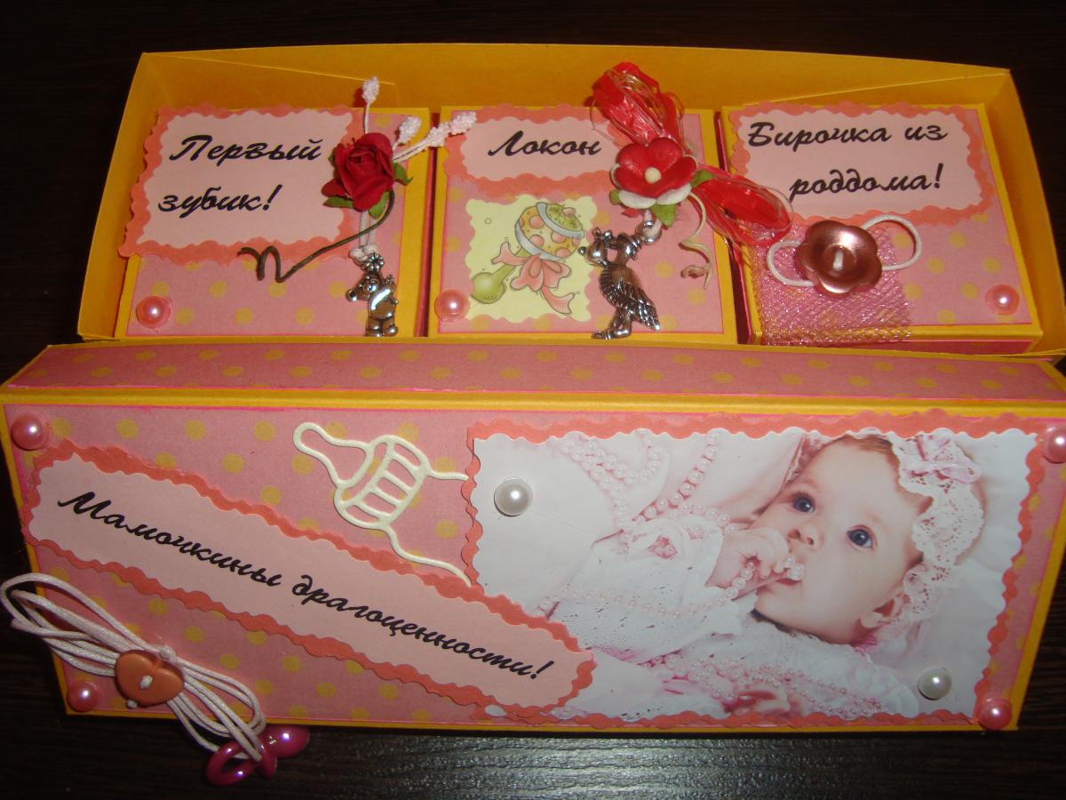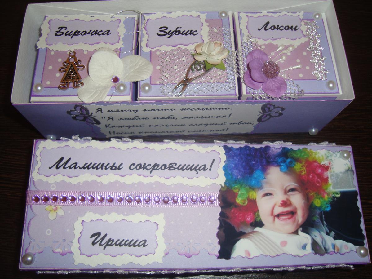 ЖОРКА Опубликовано 1 декабря, 2013 Опубликовано 1 декабря, 2013 У каждой мамочки есть догорие сердцу мелочи ,хронящие воспоминания , первый выпавший зубик, локон волос, бирочка из роддома и все валяется там и сям предлогаю вам красивое и милое место их хранения! я недавно занялась скрапбукингом на открытках и шоколадницах не остановлюсь это я сделала своей малявочке