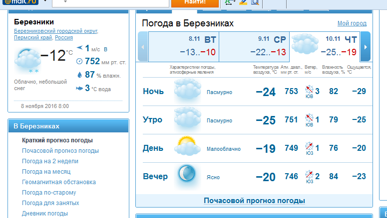 Димас77 Опубликовано 8 ноября, 2016 Опубликовано 8 ноября, 2016 , 14 ноября Tемпература воздуха, °CF Атм. давл., мм рт. ст.гПад. рт. ст. Ветер, м/смиль/ч Влажность воздуха, % Ощущается, °CF Ночь Облачно −28-18 761301015 В 247 78 −32-26 Утро Облачно −28-18 761301015 ЮВ 124 75 −30-22 День Облачно −23-9 761301015 ЮВ 124 74 −23-9 Вечер Пасмурно −19-2 760301013 Ю 124 76 −19