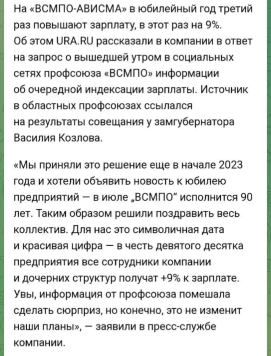 Таргитай69 Опубликовано 10 марта, 2023 Опубликовано 10 марта, 2023 С 1 марта работники Корпорации ВСМПО-АВИСМА станут получать больше, у ряда категорий рабочих специальностей повышение составит до 40%. Подход к повышению зарплаты дифференцированный. В первую очередь внимание уделили сотрудникам цехов, в которых производится основная продукция — это плавильщики, кузнецы, токари, фрезеровщики, машинисты кранов и т.д. Особый подход был к высококвалифицированным сотрудникам отдельных профессий, которые остро востребованы на рынке труда, а также к работникам низкоквалифицированных специальностей. Процент повышения среди основного производственного персонала составит от 6% до 40% и будет превышать средний показатель по Свердловской области и по Пермскому краю.