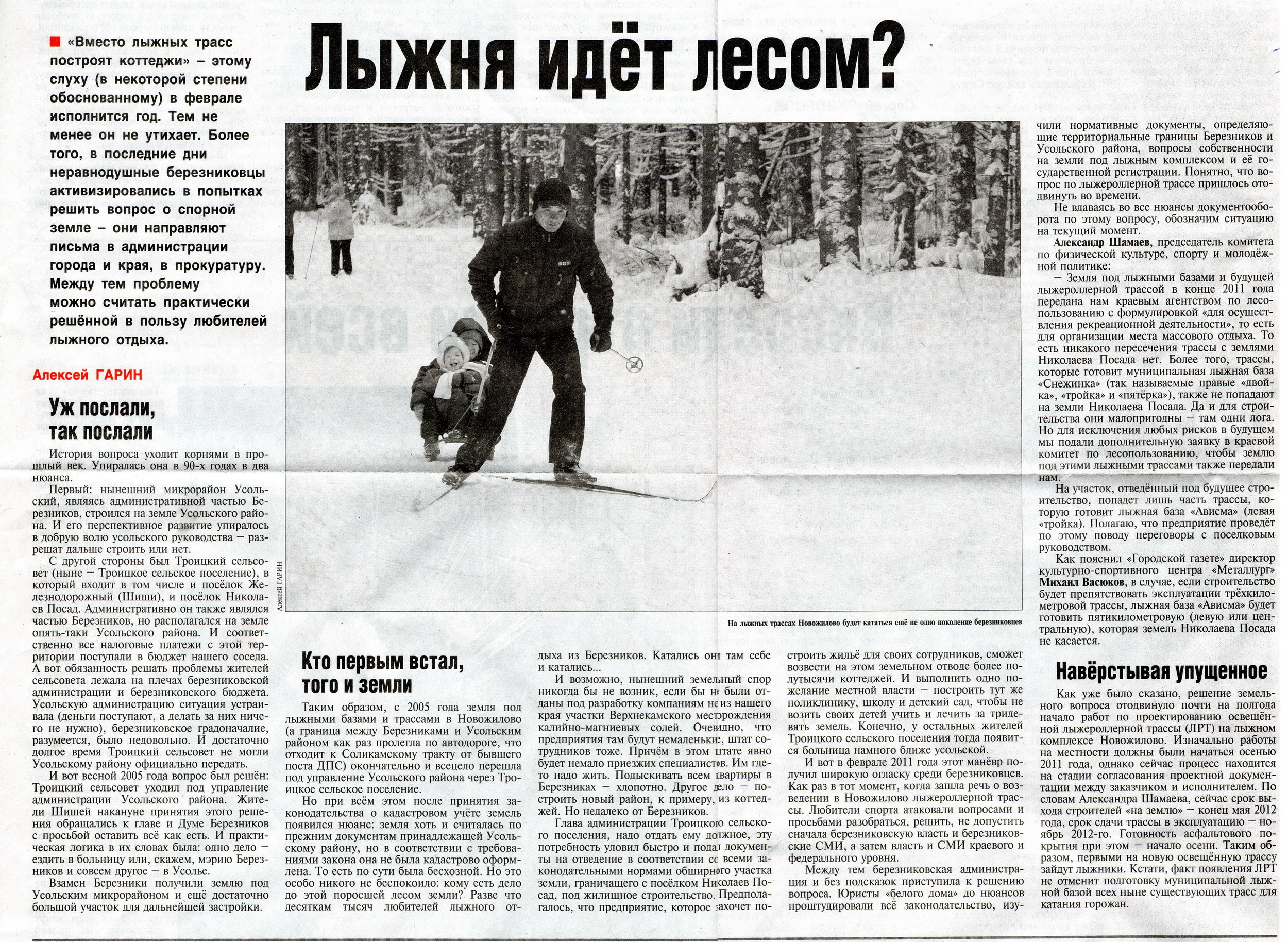 rum Опубликовано 26 января, 2012 Опубликовано 26 января, 2012 30.09.2010 Планы постройки лыжероллерной трассы в лыжном комплексе Новожилово были озвучены в рамках концепции развития физкультуры и спорта в городе Березники до 2015 года. Концепция была утверждена на сентябрьском заседании Березниковской городской Думы. На программу за 5 лет предполагается направить 264 млн. рублей, в том числе 97 млн. рублей – средств местного бюджета, остальные – краевого и федерального. Большую часть средств предполагается потратить на реконструкцию, строительство и капремонт спортивных объектов. Планируется построить лыжероллерную трассу в Новожилово, провести реконструкцию стадиона «Агрохим», закончить ремонт дворца спорта «Темп». http://www.beriki.ru/2010/09/30/na-severe-prikamya-postroyat-lyzherollernuyu-trassu-i-sportom-zaimetsya-kazhdyi-tretii Вот! Задача строительства л-р. трассы поставлена думой. Что сейчас предпринимает дума для осуществления своих планов? Нет , мы зачем тут распаляем себя? :wink: Вот свежачок: 24.11.2011 Березниковский мэр провёл ряд встреч с городским населением ... В следующем году начнется реконструкция стадиона «Агрохим», будет построена лыжероллерная трасса в районе лыжного комплекса «Новожилово», завершится капитальный ремонт Дворца спорта «Темп» ... http://www.beriki.ru/2011/11/24/bereznikovskii-mer-provel-ryad-vstrech-s-gorodskim-naseleniem Думские думы 07.09.2011 Строительство лыжероллерной трассы в Новожилово решили разделить на два эта- па — собственно строительство трассы и организация её освещения. До конца года планируется провести вырубку деревьев и земляные работы по подготовке трассы. Асфальтирование и освещение трассы предстоит выполнить в будущем году. http://www.beriki.ru/2011/09/07/dumskie-dumy То есть мэр и дума не в курсе проблем с административным делением, или вопрос уже решён и проблема снята? :-k