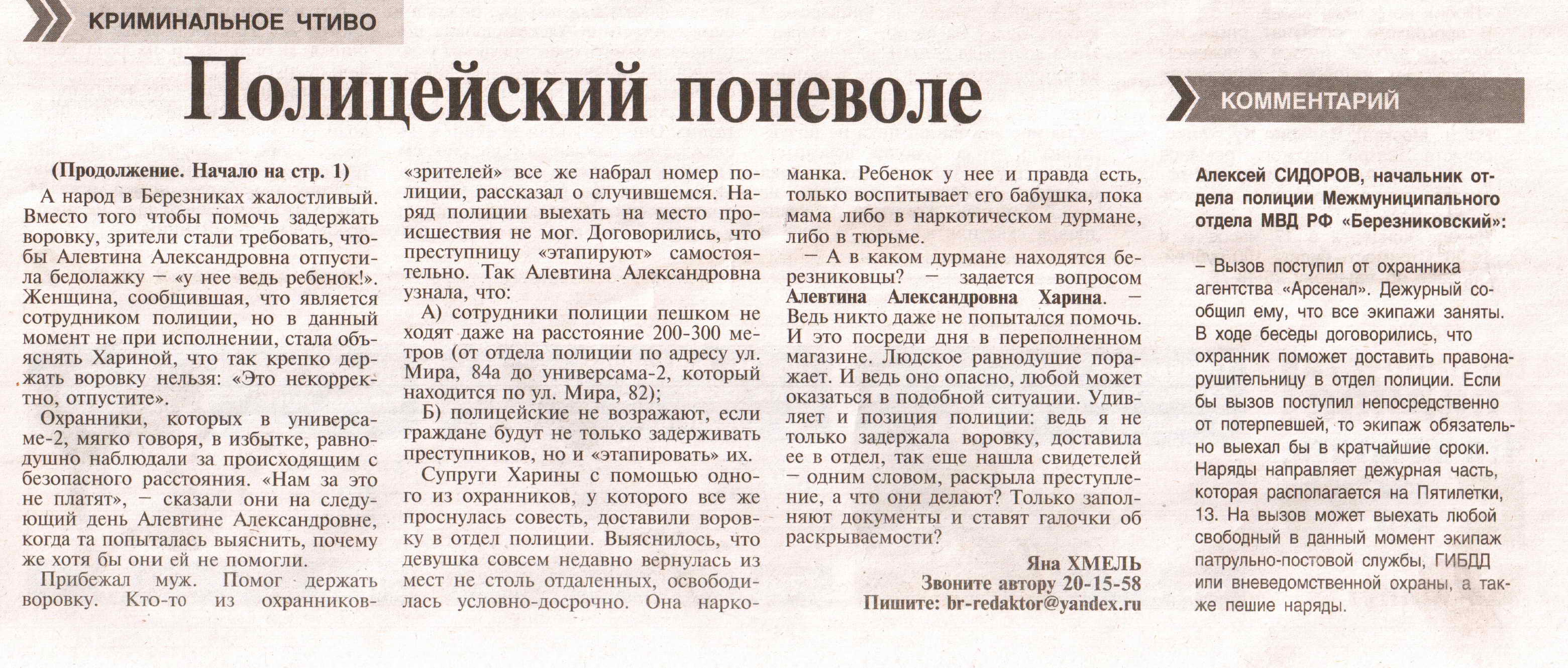 я-саша Опубликовано 9 января, 2012 Опубликовано 9 января, 2012 в березниковских новостях нужно показывать сводки криминала за истекшую неделю и не скрывать лица задержаных преступников пусть ихвидят все даже их родственники тогда им хоть стыдно будет людям в газа смотреть Да вроде правильно, но непонятно, чего показывать. Просто такое ощущение, что Березниковская полиция совсем ничего не делает. На работу оне приходят, патрули на маршруте, но чего делают? По жизни приходилось обращаться, толку- как от козла молока. Пока их лично не коснётся, ничего не делают. Ну что, следователь бегать будет, как в кино? Да нет конечно. Подбирали раньше пьяных по городу, и все дела. На остановке строит. техникума видел, как сержант покупал у тётки спирт, блеааа, куча народу, а он втихушу оглядывается, в кустиках под куртку бутылку суёт, ну кто нас защищает! Вот этот дебил? Так и чего им показывать по телевизору? Придумывать самим задержания?