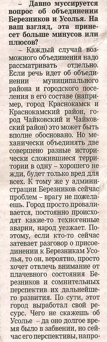 На февраль председатель правительства запланировал большое совещание по проблеме «Усоль-ского-2» с присутствием главного федерального инспектора и представителей надзорных органов. «Мы тогда подведем итоги, что сделано и какие решения необходимо принять в ближайшее время, чтобы эту проблему решить, — сказал он. — Надеюсь, в первом полугодии как-то определимся, что делать с этими домами, в окончательном варианте. Но могу сказать, что ряд интересных идей использования этих домов выдвинули и руководство «Уралкалия», и руководство города. Пока не могу раскрывать, какие, но интересные идеи».
