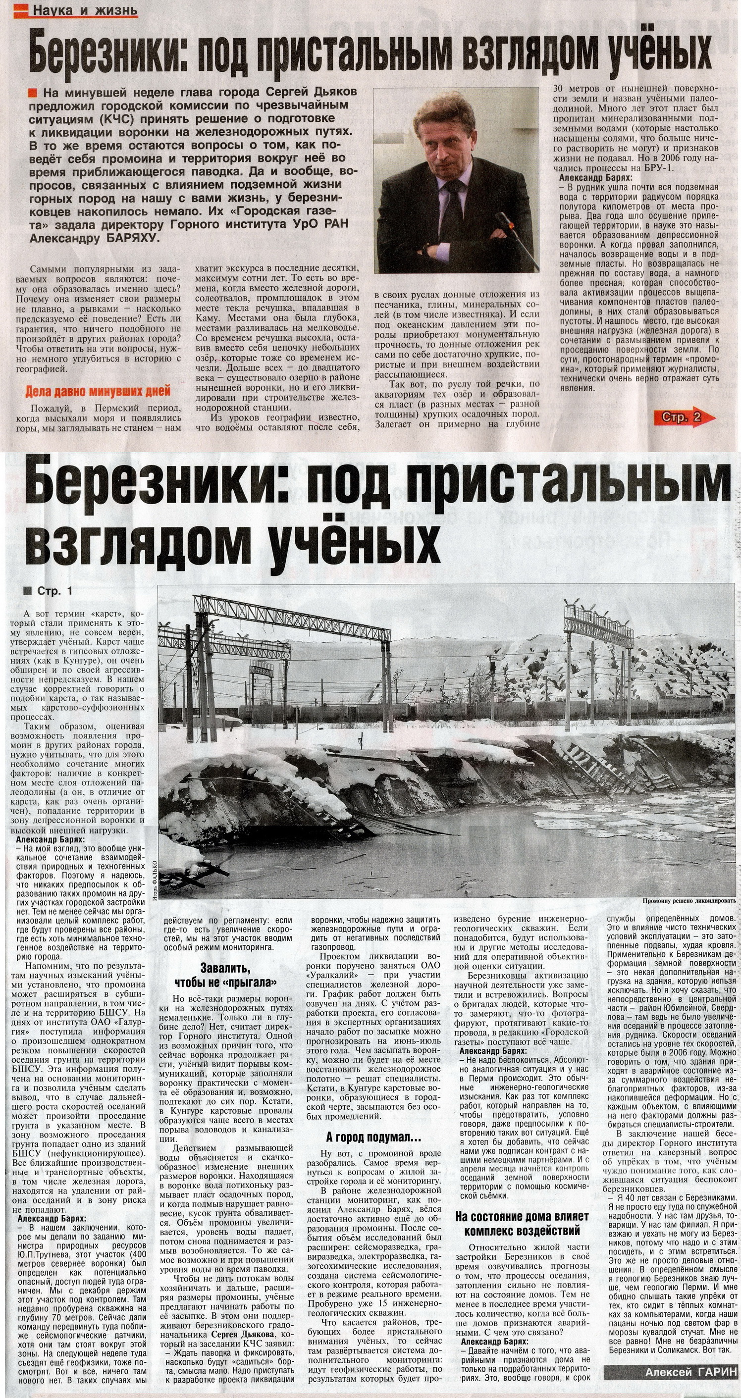 alex7r Опубликовано 12 апреля, 2011 Опубликовано 12 апреля, 2011 С уралкалиевского сайта: Риск образования нового проседания грунта вблизи г. Березники Компания «Уралкалий» получила информационное сообщение от Уральский научно-исследовательский и проектный институт ОАО «Галургия» (г.Пермь) о произошедшем однократном резком повышении скоростей оседания грунта на территории дочернего предприятия «Березниковское шахтостроительное управление» (БШСУ). Эта информация получена на основании данных маркшейдерского, сейсмологического и газогеохимического мониторинга, который позволяет прогнозировать нестандартное поведение почвы, выявлять точки риска и принимать своевременные меры. На основании анализа данных мониторинга специалисты ОАО «Галургия» сделали вывод, что в случае дальнейшего роста скоростей оседаний может произойти проседание грунта в указанном месте. В зону возможного проседания грунта попадает одно из зданий БШСУ. Оно является нефункционирующим, поскольку ранее зона в районе БШСУ отмечалась как потенциально опасная. Все ближайшие производственные и транспортные объекты, в том числе железная дорога, находятся на удалении от района оседаний и в зону риска не попадают. В настоящий момент в зоне БШСУ осуществляется усиленный маркшейдерский, сейсмологический и газогеохимический мониторинг, камера видеонаблюдения фиксирует все происходящее. В целях безопасности данный район оцеплен, пребывание людей и техники в зоне исключено. В случае, если в соответствии с прогнозом ОАО «Галургия» проседание грунта случится, это не должно отразится на текущей производственной деятельности «Уралкалия», ОАО «РЖД» и других промышленных предприятий.