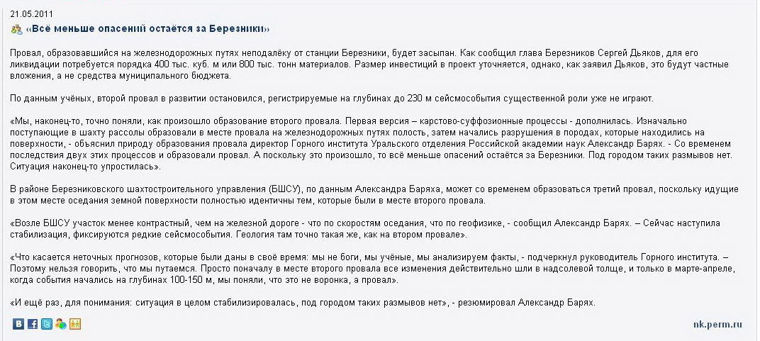 GreyBeard Опубликовано 8 июня, 2011 Опубликовано 8 июня, 2011 (изменено) Нет сил читать снова даже ''конец пейджера''. Это уже все читали? Действительно будут ''закапывать''? «Всё меньше опасений остаётся за Березники»Провал, образовавшийся на железнодорожных путях неподалёку от станции Березники, будет засыпан. Как сообщил глава Березников Сергей Дьяков, для его ликвидации потребуется порядка 400 тыс. куб. м или 800 тыс. тонн материалов. Размер инвестиций в проект уточняется, однако, как заявил Дьяков, это будут частные вложения, а не средства муниципального бюджета. «Мы, наконец-то, точно поняли, как произошло образование второго провала. Первая версия – карстово-суффозионные процессы - дополнилась. Изначально поступающие в шахту рассолы образовали в месте провала на железнодорожных путях полость, затем начались разрушения в породах, которые находились на поверхности, - объяснил природу образования провала директор Горного института Уральского отделения Российской академии наук Александр Барях. - Со временем последствия двух этих процессов и образовали провал. А поскольку это произошло, то всё меньше опасений остаётся за Березники. Под городом таких размывов нет. Ситуация наконец-то упростилась». Ссылки, почему-то, с помощью BB-кода не вставились, вот они в ''графическом'' виде: Собственно, вот заметка со второй ссылки: Изменено 8 июня, 2011 пользователем BlackNess