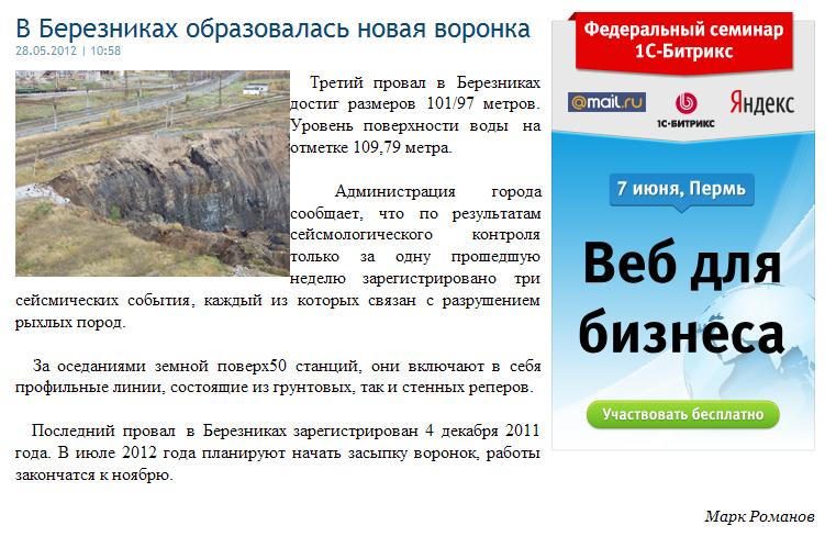 RomanIzrailevich Опубликовано 26 мая, 2012 Опубликовано 26 мая, 2012 ... Метастазы, видимо, во внимание не принимаются: если принять, уж очень намного вырастет... Судя по оседаниям метастазы есть и они дадут о себе знать. Подведены комплексные итоги наблюдения за ситуацией на БКПРУ-1 ОАО «Уралкалий» за период с 18 по 24 мая 2012 г. Продолжаются наблюдения за районом засыпанной воронки на железнодорожных путях. За прошедшую неделю зарегистрировано три сейсмических события, с большой вероятностью обусловленные подвижками засыпанной в воронку песчано-гравийной смеси. ... По результатам сейсмологического контроля за прошедшую неделю зарегистрировано 3 сейсмических события, связанных с процессами разрушения в рыхлых породах к северу от здания АБК БШСУ. Эпицентры сейсмических событий располагались в центральной части воронки и вблизи ее северного и восточного бортов. ...За период со 16 по 23 мая скорости оседаний в контуре засыпанной воронки на железнодорожных путях составили 97-358 мм/месяц, с северной и южной сторон – 11-21 мм/месяц. С 25 апреля по 23 мая в районе здания АБК БШСУ скорости оседаний составили 40-49 мм/месяц, в районе гаражей и спортзала – 8-49 мм/месяц, между зданием спортзала и воронкой на железнодорожных путях – 179 мм/месяц, внутри автодорожного кольца – 10-14 мм/месяц. В районе пересечения улиц Березниковская и Тельмана за аналогичный период скорости оседаний составили 3-7 мм/месяц. http://admbrk.ru/102/103/_aview_b1798