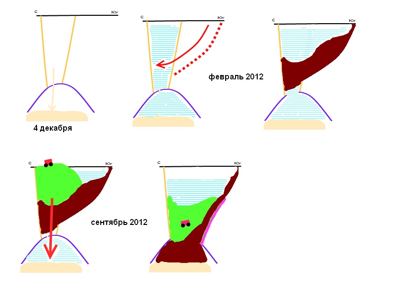 vash-styl Опубликовано 14 сентября, 2012 Опубликовано 14 сентября, 2012 Описываю коротко ещё одну версию от знающего и серьезного человека (с приложением картины в стиле абстракционизма) Первоначальной глубины Крохи мы не знаем - никто не измерял, но скорей всего было глубоко, даже не буду предполагать цифру - не меньше Малыша. Размеры Крохи по данным на 9 февраля были 82 на 64 метра. Но уже 16 февраля ширина резко изменилась - 89 на 85. Напрашивается - обвал, массив съехал и заткнул горло провала. Где-то в мае-июне замеряли глубину - максимально оказалось около 55 метров в месте, где родилась Кроха и где начали засыпку. Навалили 360 тыс. тонн на эту насыпь-пробку и она в итоге обвалилась 12 сентября. Не знаю, что там говорил Мараков по поводу пролома известняковых слоев, но найденные данные по этому району не подтверждают его слов. Спорить с маститым ученым я, конечно,не могу. Зато надо мной никто не стоит. Но такая версия имеет место быть. Примерное геологическое строение в данном районе выглядит примерно так Первые 10 метров - пестрая смесь из слоев песка, глины, суглинков, известняка. От 10 до 70 - слой известняка. От 70 до 130 - слоямии - мергель и глина Ниже переходная пачка (слои кам. соли и глины), далее уже каменная соль (15-20 м) и карналиты-сильвиниты. Версия очень логичная , вот только в нее не укладывается выброс метана и резкое падение уровня воды после обрушения - как мне кажется... или под "пробкой" образовалась воздушная полость (скопление метана вследствии растворения карналита) , тогда выброс метана возможен..