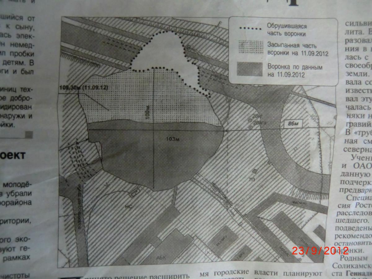 WestUralMonitor Опубликовано 24 сентября, 2012 Опубликовано 24 сентября, 2012 По состоянию на 20 сентября размеры воронки составляют 130 на 106 метров. По результатам анализа инструментальных наблюдений, выполненных ОАО «Галургия» за период с 10.09.2012 г. по 16.09.2012 г., сделано заключение об исключении пребывания людей в пределах границ ограждения опасной зоны у воронок на железнодорожных путях и севернее АБК БШСУ. По этой причине уровень воды в воронке севернее здания АБК БШСУ не определялся. источник