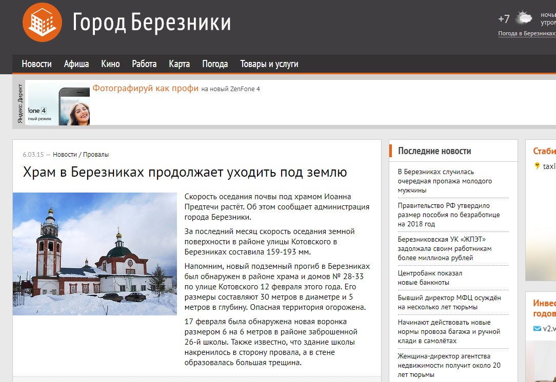 mex@nik Опубликовано 13 октября, 2017 Опубликовано 13 октября, 2017 (изменено) В Березниках подведены комплексные итоги наблюдения за ситуацией на БКПРУ-1 ПАО «Уралкалий» за период с 29 сентября по 5 октября 2017 года. По сообщению ПАО «Уралкалий», на 5 октября скорости оседания в самом «быстром» месте — в районе домов №31-33 по ул. Котовского снизились и составили 178-197 мм в месяц. Несмотря на это оседания в этом районе вплотную прилегающего к закрытой церкви Иоанна Предтечи приблизились к 12 м, составив 11,8 м с момента начала наблюдений после аварии на руднике БКПР-1 в октябре 2006 года. В районе ул. Котовского сейсмических событий зарегистрировано не было, — утверждают учёные Горного института Уральского отделения Российской академии наук, которые на протяжении последних лет активно мониторят ситуацию. По итогам последних результатов инструментальных наблюдений на 29 июня размеры воронки, которая образовалась весной 2017 года восточнее от дома № 29 по ул. Котовского, составляют 8 на 11,8 м, глубина — 12 м. Напомним, изначальные размеры этого новообразования были 2,6 на 3,8 м. Позже, 9 апреля 2017 года, здесь же образовалась вторая воронка, размеры которой к концу апреля составляли 7,5 на 9 метров, а глубина 8 метров. Тем самым на конец июня этот провал заметно увеличился — на треть увеличился в самой широкой части и на столько же стал глубже. К сожалению, на заседании КЧС ПАО «Уралкалий» и учёные Горного института Уральского отделения Российской академии наук не смогли привести более свежих данных по этим новообразованиям. Тем временем администрация Березников вынуждена была с июня запретить доступ в гаражный кооператив «Калиец» в связи с обрушением крыш ряда боксов будет запрещен. Это решение было принято на основании рекомендаций группы КЧС города. https://www.newsko.r...nk-4344390.html 6.03.15 — Новости / Провалы Скорость оседания почвы под храмом Иоанна Предтечи растёт. Об этом сообщает администрация города Березники. За последний месяц скорость оседания земной поверхности в районе улицы Котовского в Березниках составила 159-193 мм. Напомним, новый подземный прогиб в Березниках был обнаружен в районе храма и домов № 28-33 по улице Котовского 12 февраля этого года. Его размеры составляют 30 метров в диаметре и 5 метров в глубину. Опасная территория огорожена. https://www.#$реклам...$#.ru/news/7073 Изменено 13 октября, 2017 пользователем mex@nik