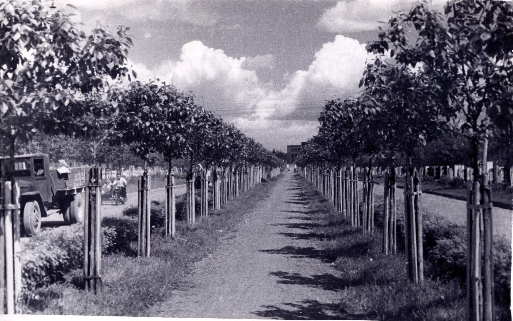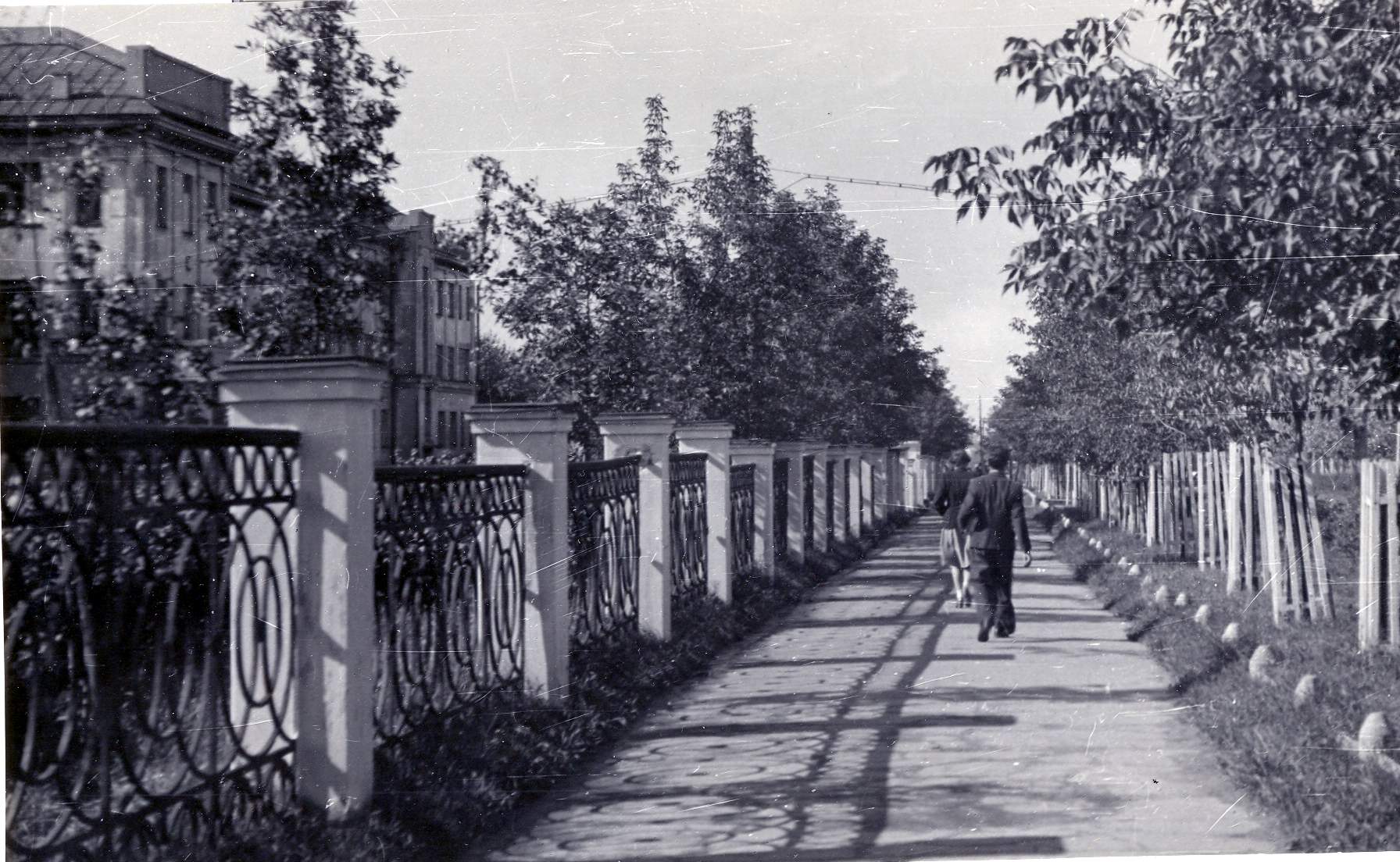 Вот по правой стороне вроде бы за тротуаром фирменный березниковский забор. Съемка ведется примерно с траверза техникума. которого тоже видимоеще нет. какие будут мнения?