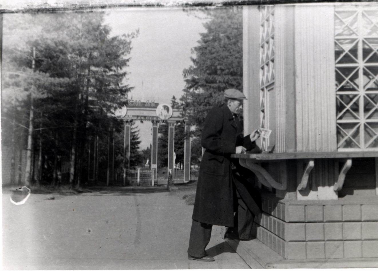 А это вход в парк. А вот где он располагался этот вход, не помню. Наверное там, где сейчас автомобильный въезд на стадион. А киоск-то закрыт! Этот товарищ явно позирует. Ещё бы разглядеть, какую денежку в руке держит.