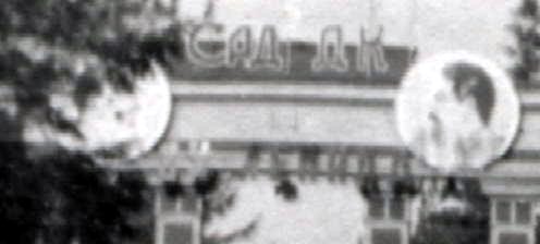 Вы правы, на фронтоне надпись "САД ДК" а ниже - "Ленина". Но перед "Ленина" ещё 2 буквы проглядываются, но какие, не разберу. А слева - точно портрет Ленина.