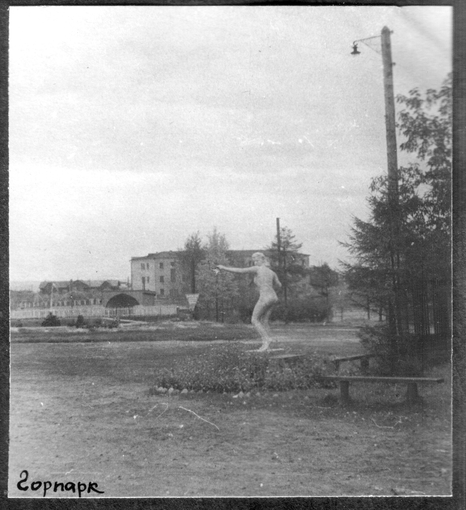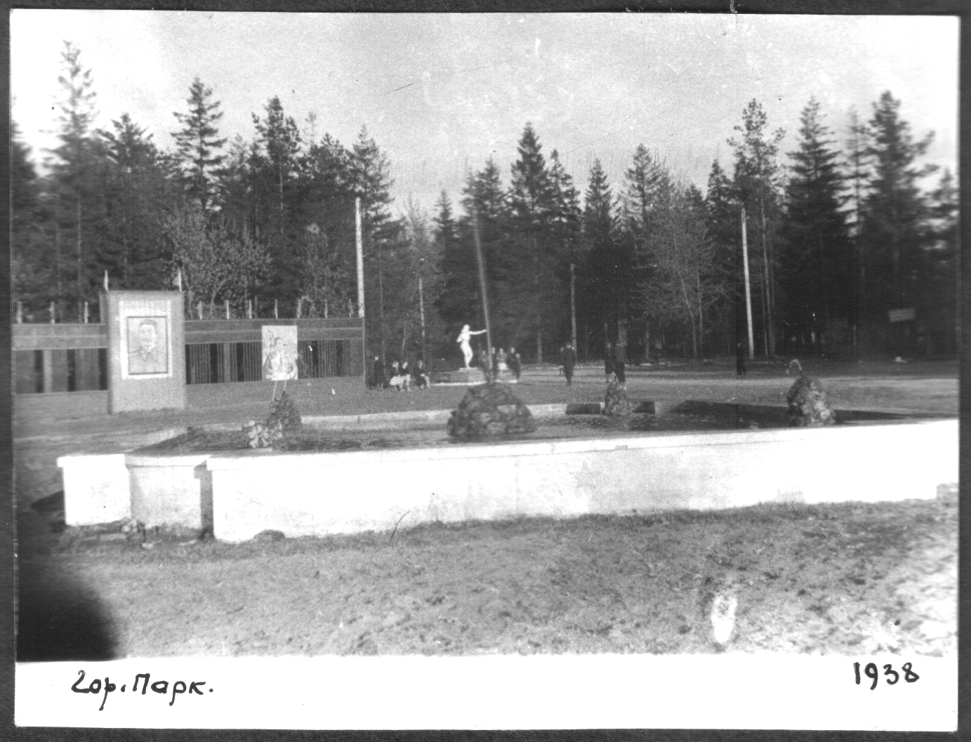 Итак - Парк Культуры и Отдыха до начала времен. Подписано на одной - 1938 год - так и будем считать. Снимки хорошо увязываются по месту наличием скульптуры некой любительницы аэробики, толкающей ядро в сторону ДК Химиков. Только вот не знаю, стоял там в это время товарищ Сталин уже или ещё нет.(Попахивает подготовкой к покушению на товарища Сталина... :() Здесь снимок этой же территории с ДК, на котором виден старый горисполком, что тоже является ориентиром. Фото баянное 40-50 гг.