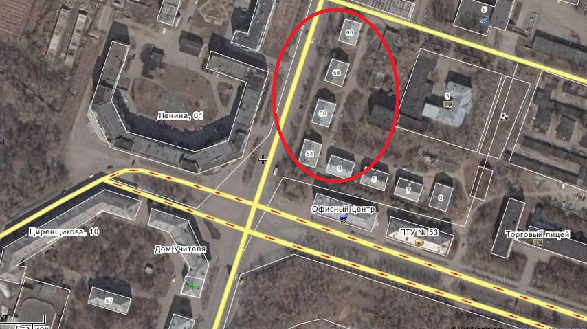 1-Ермака 62; 2-Юбилейная 9, 7, 5, 3; 3 и 4- туб.диспансер Ленина-65.