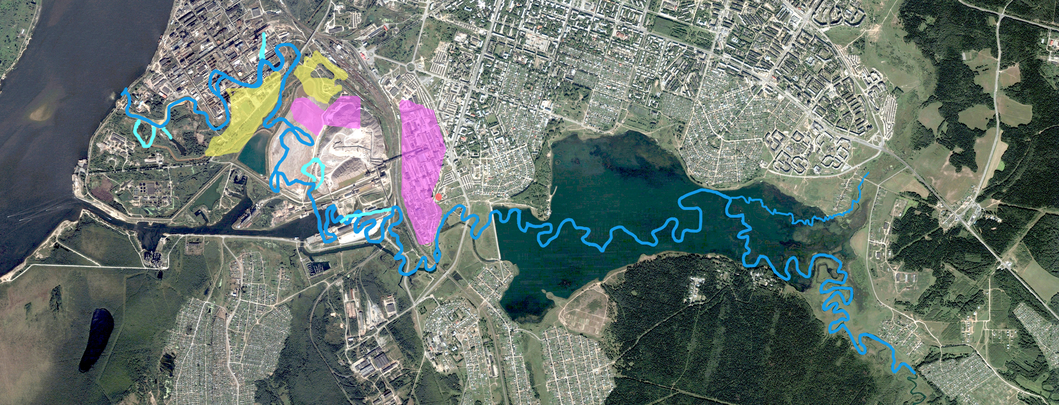 Желтое - это вроде как будет Веретья. Сиреневое - БРУ-1 и солеотвал в ранней стадии. Красный - храм Иоанна Предтечи.