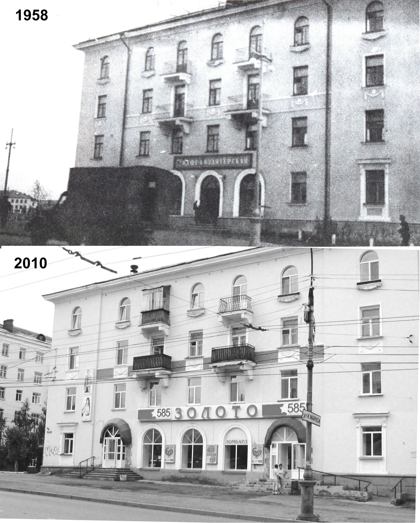 С крыши дома Челюскинцев 25 (Лесхоз) убрали весь декор. Угловой дом Челюскинцев-Карла Маркса ничуть не изменился, если не считать изменением замену части окон. Появилось несколько дополнительных дверей... И больше ничего нового... :) Застой... :)
