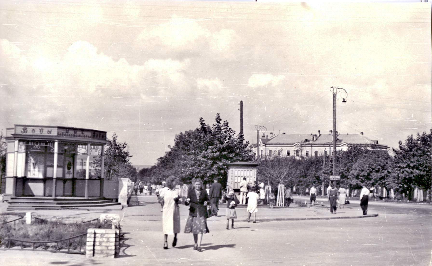 Естественно вид перекрестка с годами менялся. Это - 50-е, а обсуждалось фото 60-х. Тогда киоск (уже не павильон!) стоял у входа в сквер. А деревянное здание фотографии находилось чуть в глубине сквера прямо напротив Авангарда. И там же еще одно время стоял прямо у тротуара киоск со всякой галантереей.