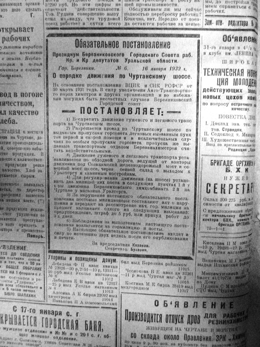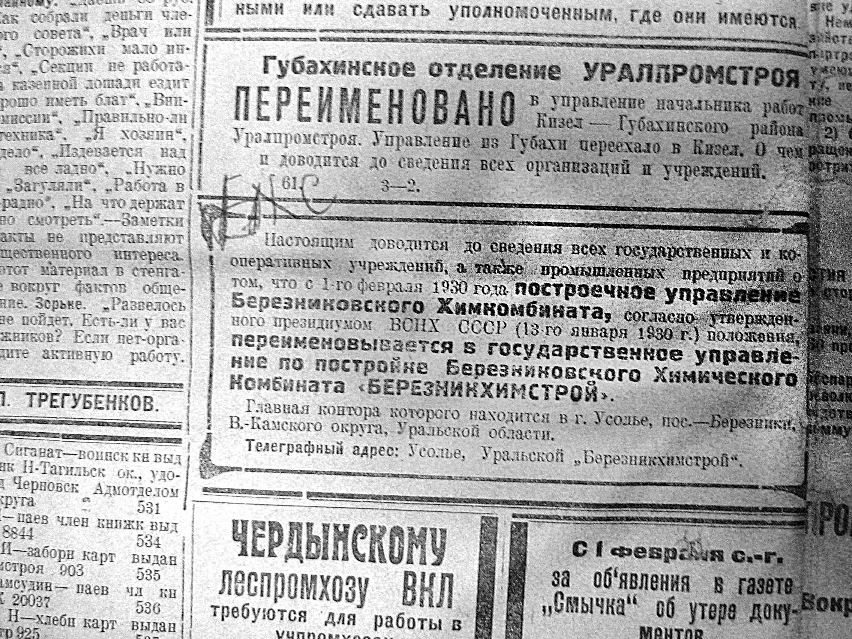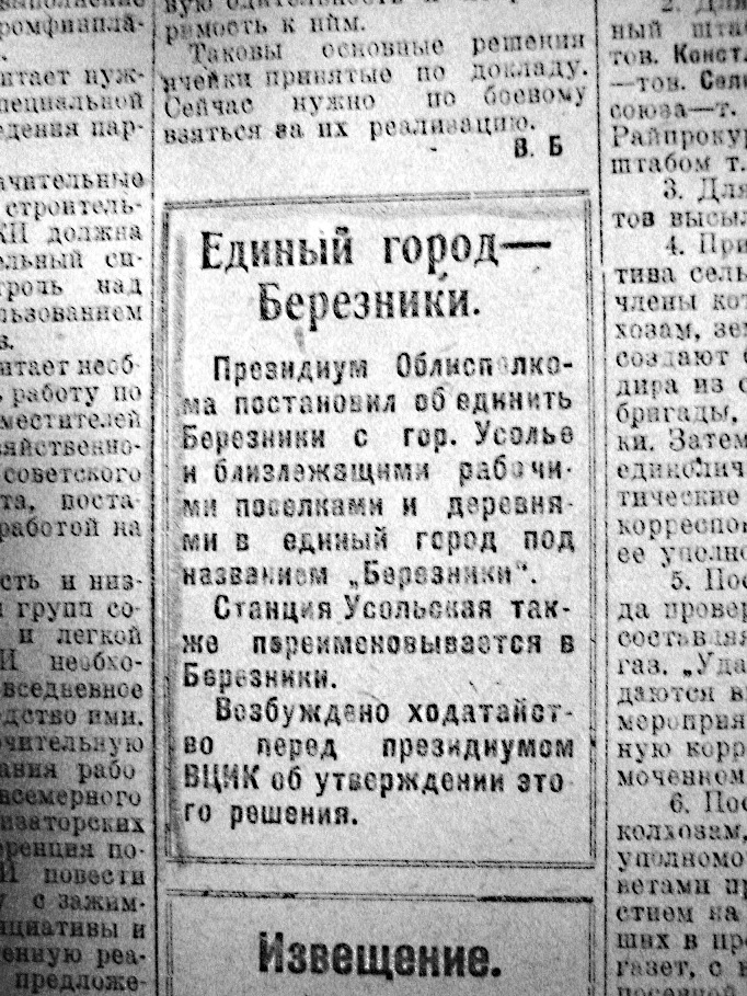 Березники как географический пункт вполне ясно попадался в газетах в 1930 году. А постановление по Чуртанскому шоссе от января 1932 - Березниковский горсовет. =D> То есть совсем не март 1932 получается город родился? =D>
