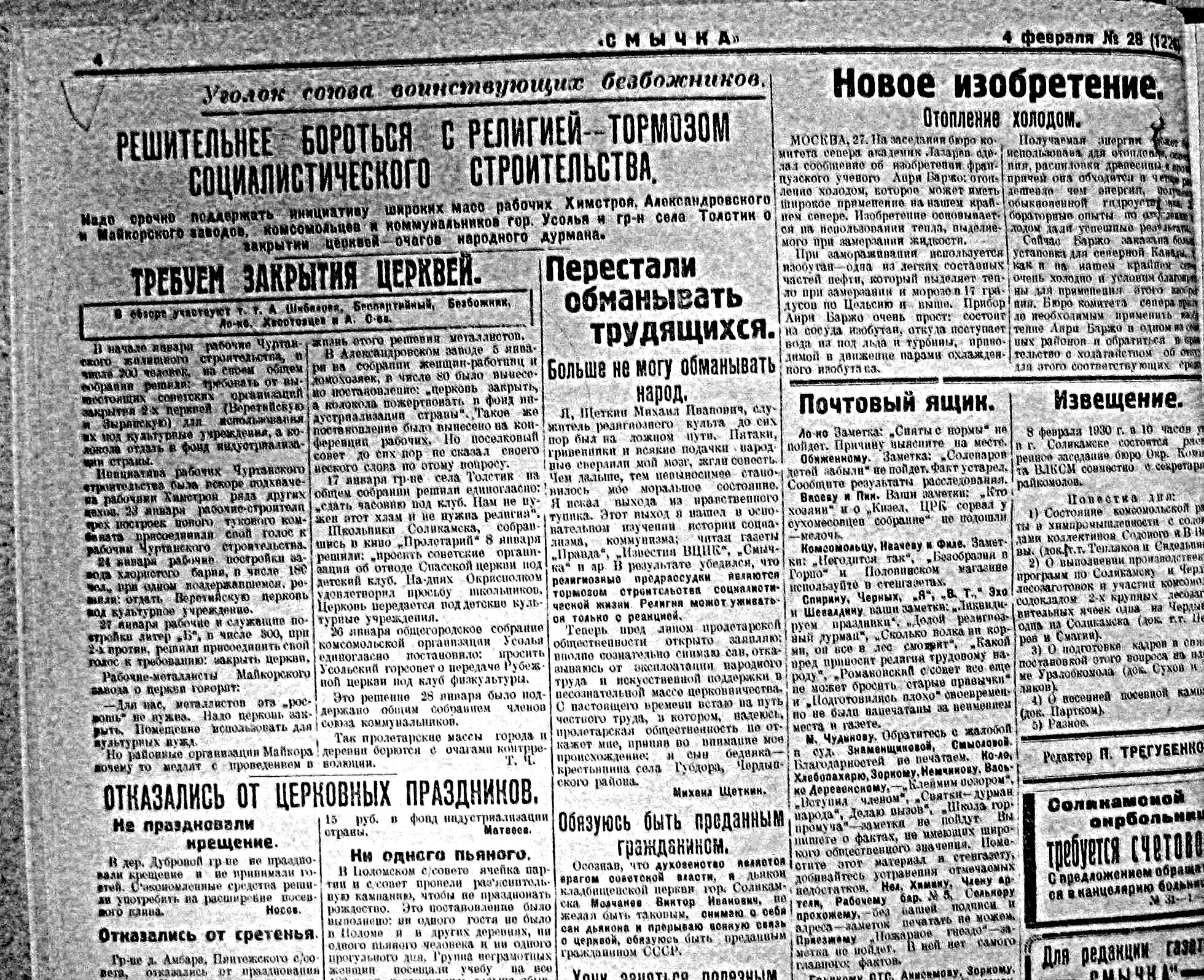 Закрытие Церквей - газета СМЫЧКА 4 февраля 1930 года