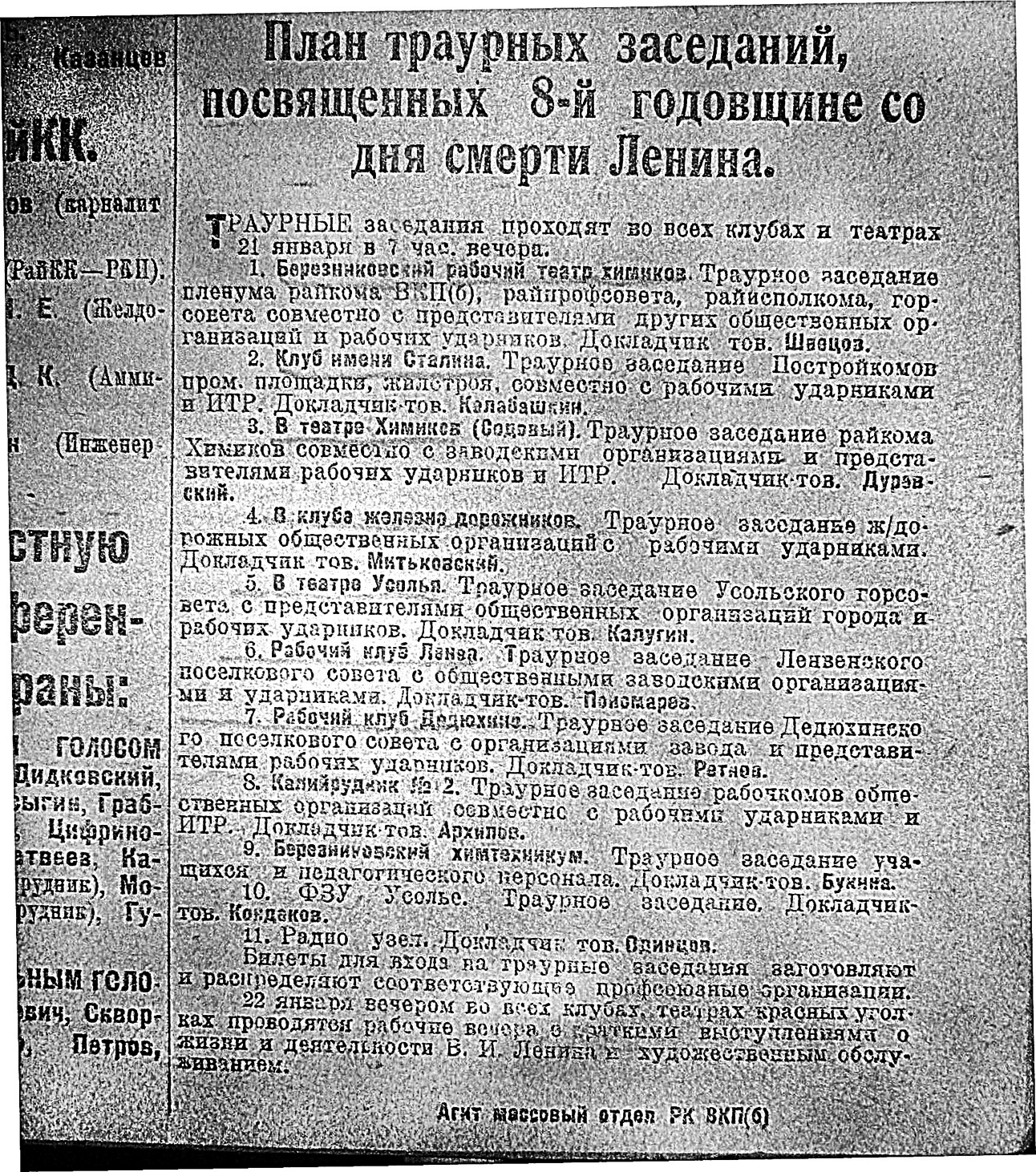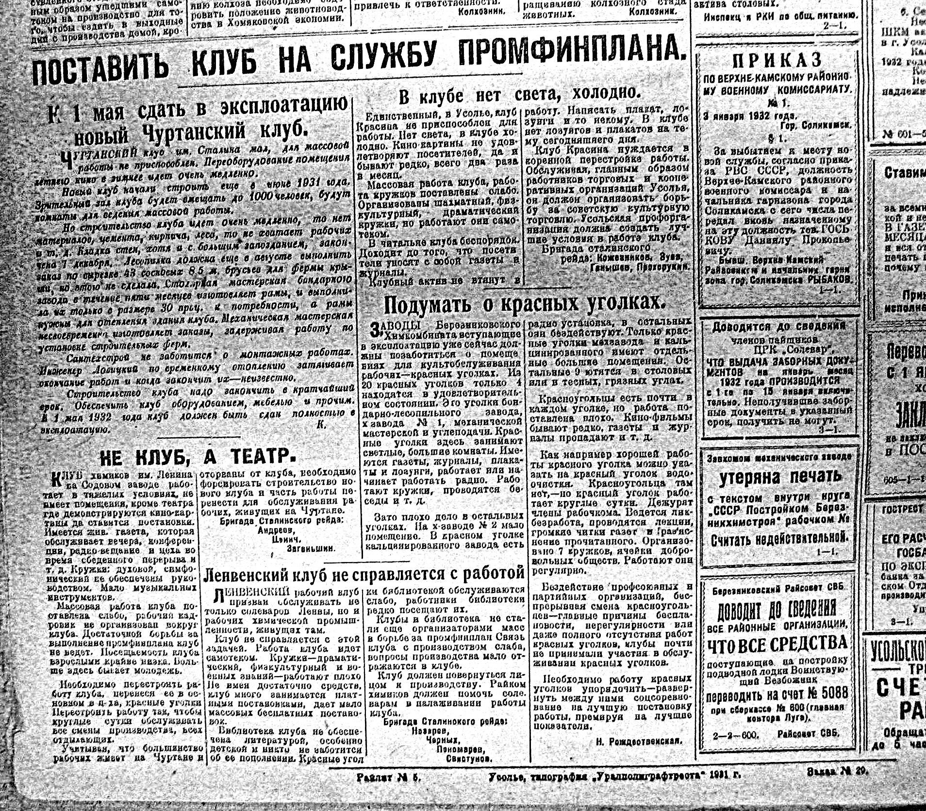 Читаем дальше. В газете Ударник от 20 января 1932 года перечислены вроде как все действующие на тот момент клубы. Затруднения в расположении вызывают три - Имени Сталина (Чуртан?), содовский Театр Химиков и Калийрудник №2. Может кто-то знает где они были?